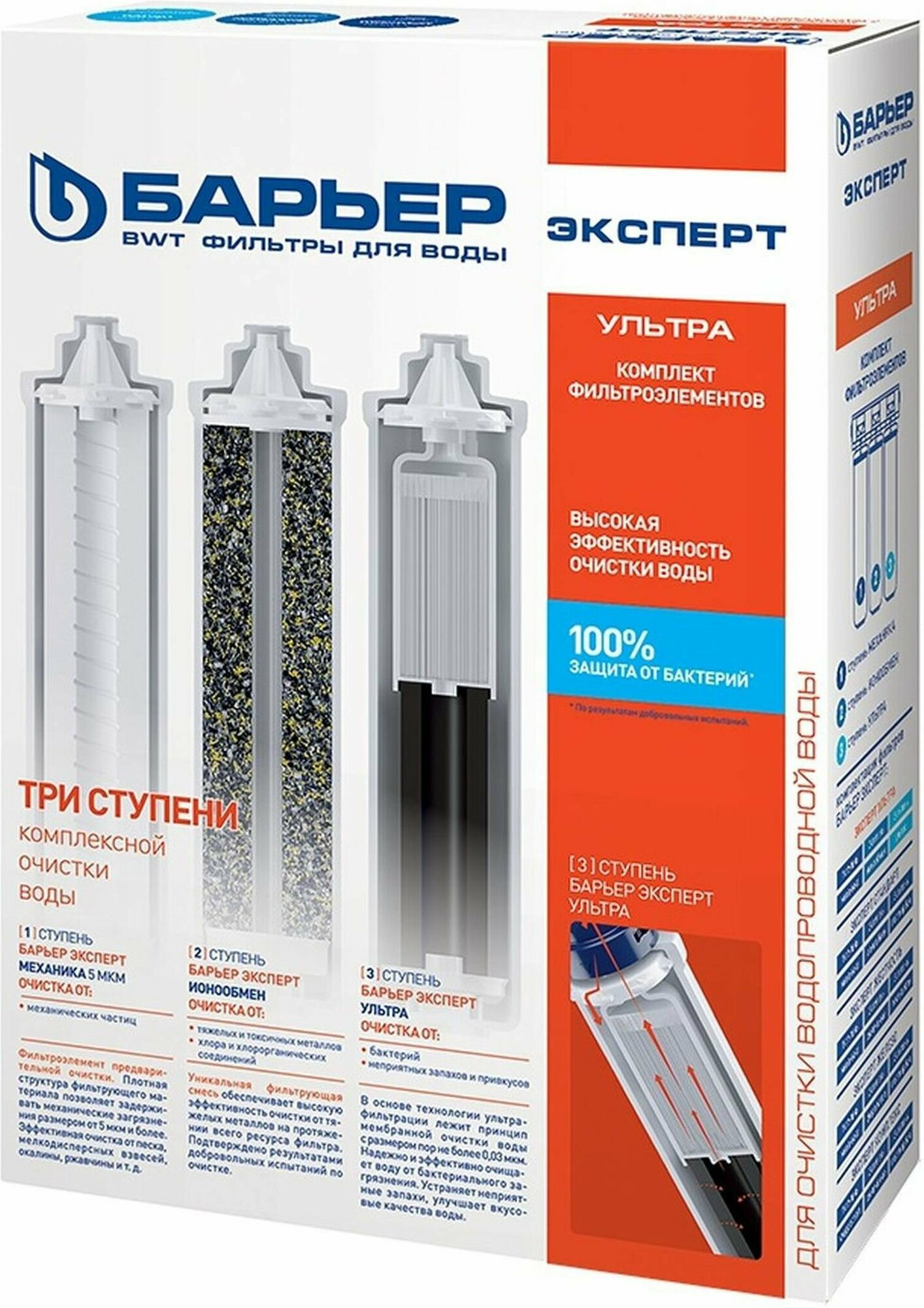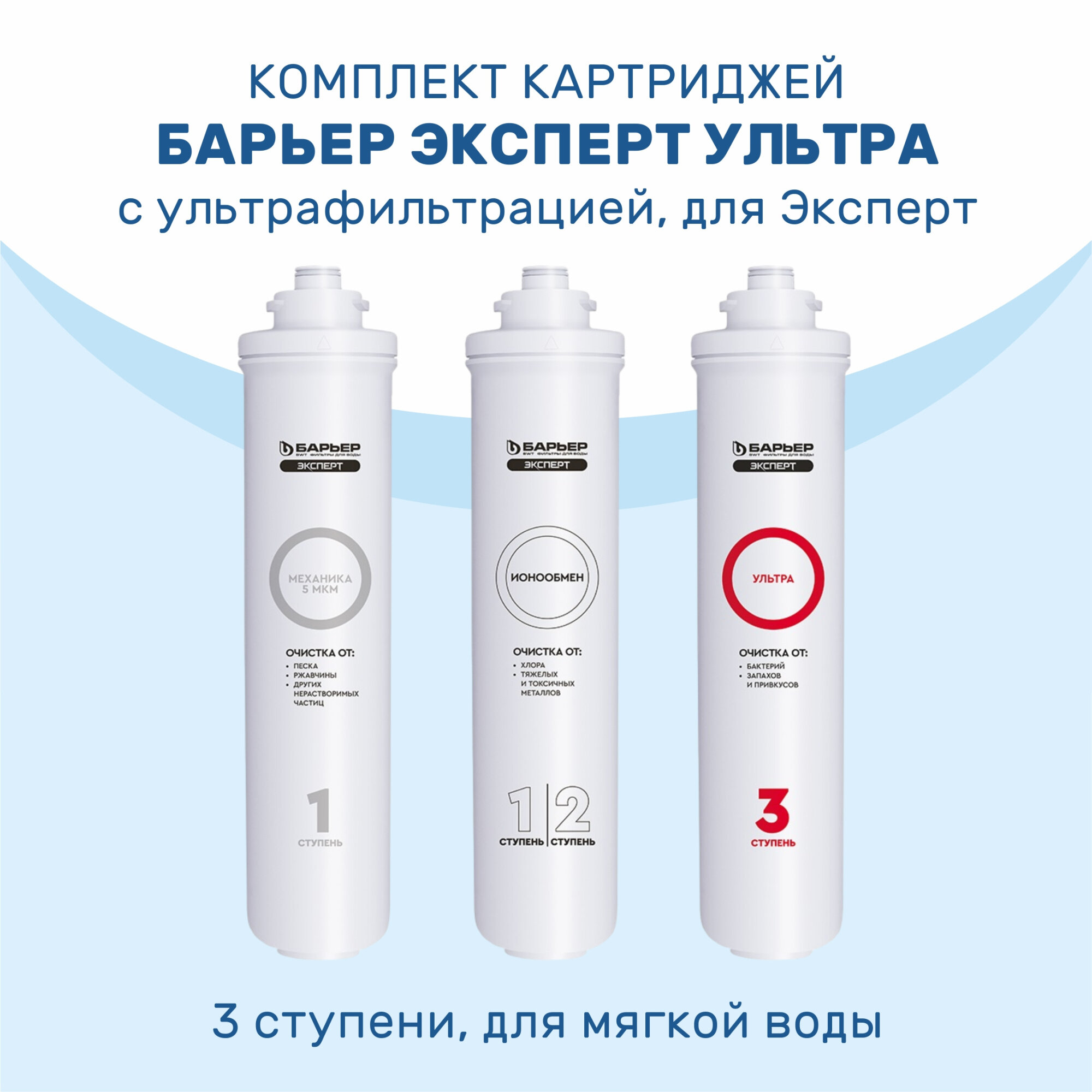 Комплект сменных картриджей с технологией ультрафильтрации. Обеспечивает комплексную очистку воды. Устанавливается в трехступенчатые фильтры для воды под мойку «Эксперт Ультра».