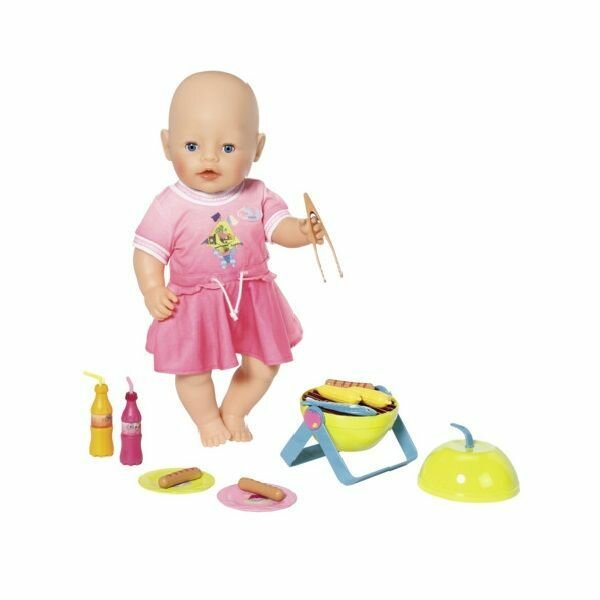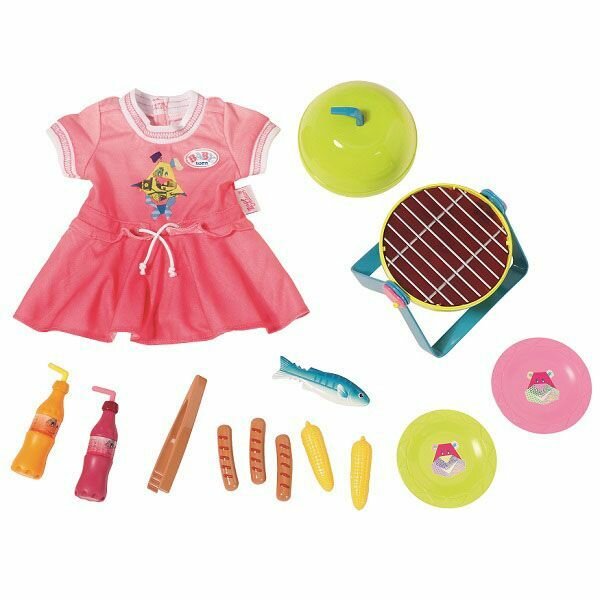 В комплект входит платье, чтобы нарядить куколку Baby born к такому важному событию, а также все необходимое для пикника: гриль, еда и напитки (сосиски, кукуруза, рыба, напитки в бутылочках), щипцы для переворачивания еды и тарелочки. Составляющие набора выглядят очень реалистично и позволят девочке сразу окунуться в атмосферу.