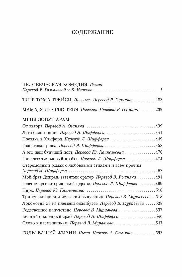 «Грустное и солнечное» творчество американского писателя Уильяма Сарояна, чье имя стоит в одном ряду с такими титанами мировой литературы, как Фолкнер, Стейнбек, Хемингуэй, хорошо известно русским читателям. Его произведения покоряют с первых же страниц, они повествуют о самых важных, самых пронзительных моментах человеческого бытия: о детстве и взрослении, о любви, дружбе и искусстве, о горе и ненависти, печали и радости. о жизни во всей ее полноте.В настоящее издание вошел роман «Человеческая комедия», повести «Тигр Тома Трейси» и «Мама, я тебя люблю», сборник рассказов «Меня зовут Арам», а также самая известная пьеса Сарояна «Годы вашей жизни», принесшая автору престижную Пулитцеровскую премию.