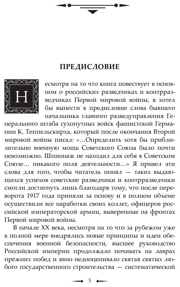 Как пишет автор в предисловии "Это - историческое повествование о Великой войне (так назвали эту войну в Европе)". Там же, в предисловии написано " Книга повествует о российских разведчиках и контрразведчиках Первой мировой войны". На самом деле , к сожалению читателей, в книге главное о российской разведке изложено в предисловии к книге! В основной части текста интересно описано многое: дела придворные (в России и Германии), интриги британских и французских дипломатов против России, русская деревня и ее быт, революционная молодежь, любовь, ход военной кампании, госпитали и сестры милосердия....