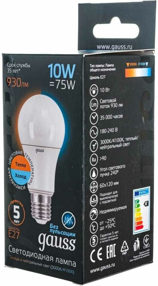 Gauss Лампа светодиодная Е27 180-240В 10Вт 3000/4100К Светодиодная лампа - это современная альтернатива традиционной лампы накаливания. От обычной энергосберегающей лампы лампу этого типа отличает отсутствие ртути, что повышает ее экологическую безопасность и облегчает процедуру утилизации. Выгорание обивки мебели, краски и прочего не происходит за счет того, что светодиодная лампа не дает УФ-излучения, а высокая устойчивость к ударам позволяет использовать ее даже для уличного освещения.