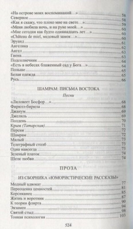 В настоящее издание вошли рассказы автора из таких сборников, как "Юмористические рассказы", "И стало так...", "Карусель", "Дым без огня" и др., а также три сборника стихотворений: "Семь огней", "Passiflora" и "Шамгам: письма Востока".