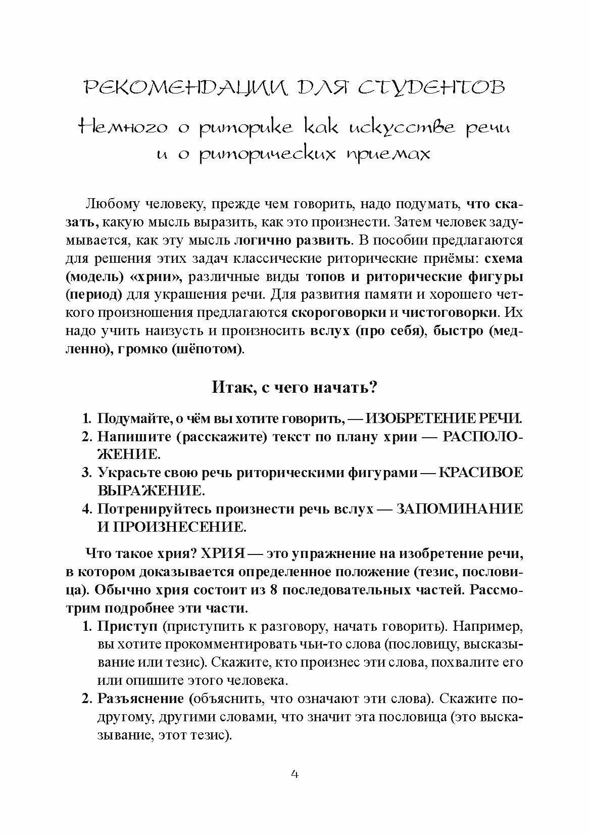 Основная задача данного пособия - научить студентов объясняться на русском языке, строить монологические и диалогические высказывания, быстро решать коммуникативные задачи, возникающие при общении в реальной жизни. Пособие построено с использованием риторических классических приёмов обучения студентов устной и письменной речи. В пособии представлены семь тем: "Путешествие", "Страна", "Кухня", "Что и как мы читаем", "Здоровье", "Поздравление", "Пишем сочинение" и рекомендации студентам и преподавателям. Диалоги, предлагаемые в пособии, охватывают современные ситуации в Китае и России.