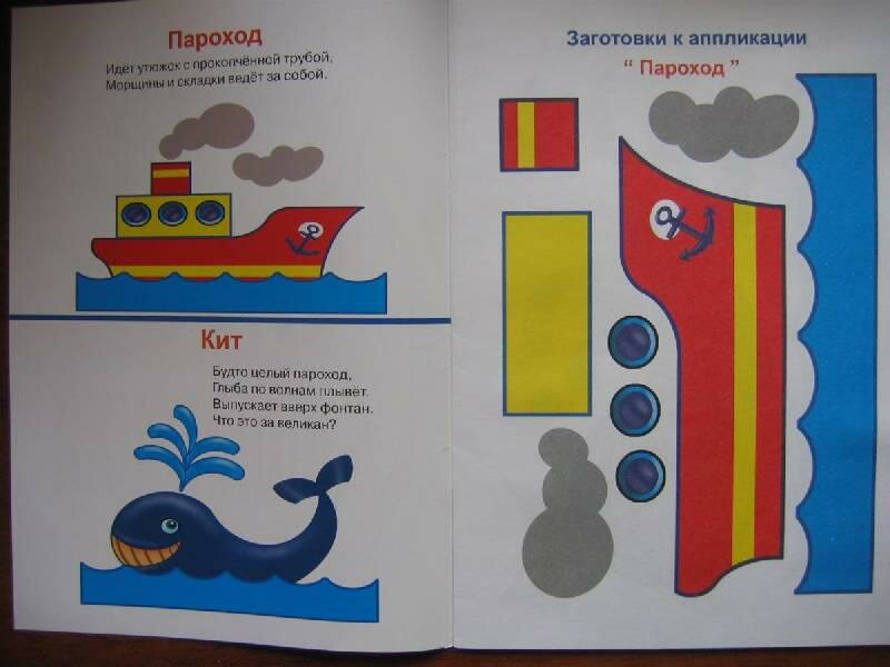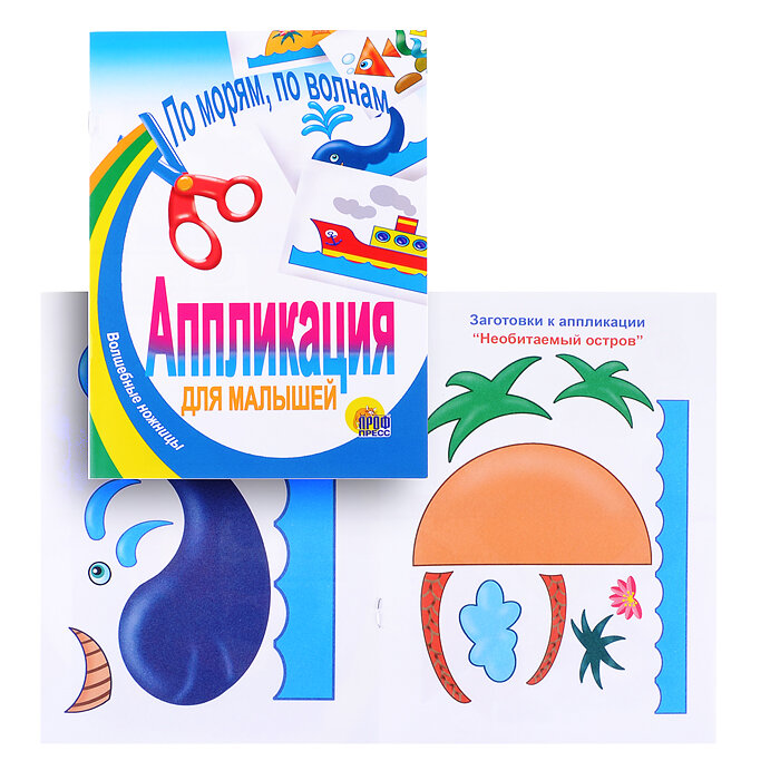 Тонкая книжечка с аппликациями из серии "волшебные ножницы". В отличие от других книг в этой к каждой картинке есть небольшое стихотворение-загадка. Картинки понравились, выглядит симпатично, за исключением рыбок... треугольник и квадратик с глазками - уж очень схематичное изображение. Каждая картинка состоит из 9-10 деталей разного размера, для первых занятий с маленькими детками еще не подойдет. В любом случае, вырезать небольшие детальки придется взрослым. За свою цену неплохой набор для занятия по аппликации.