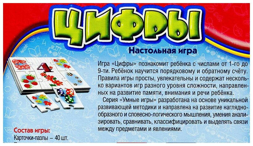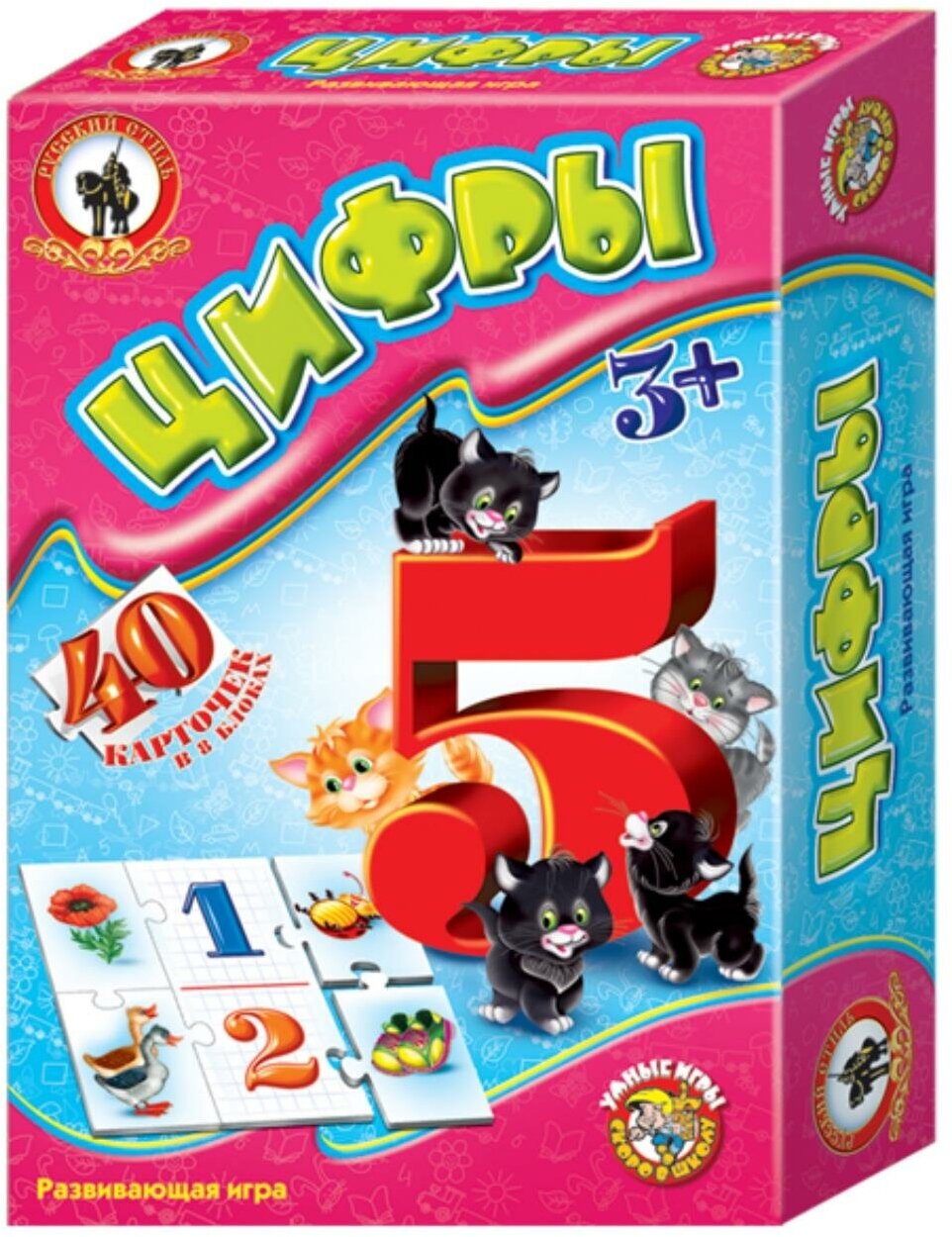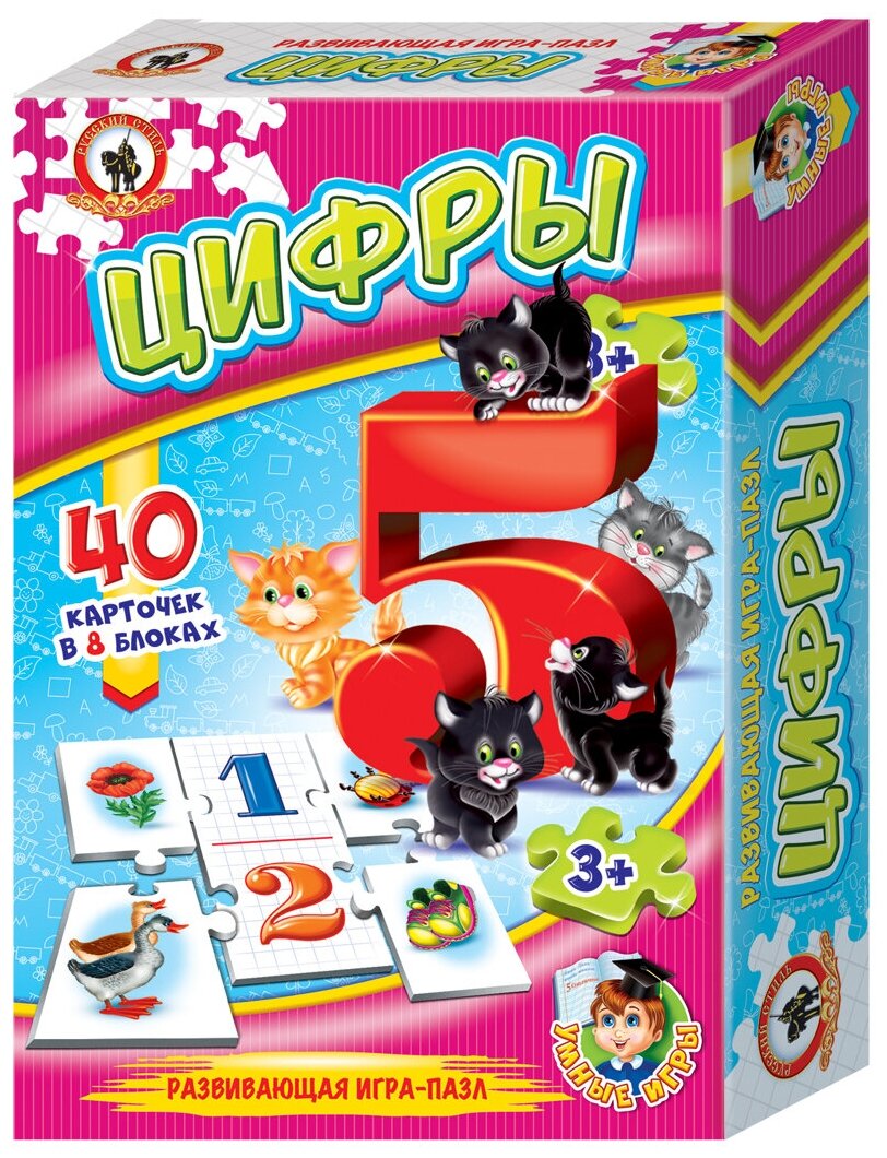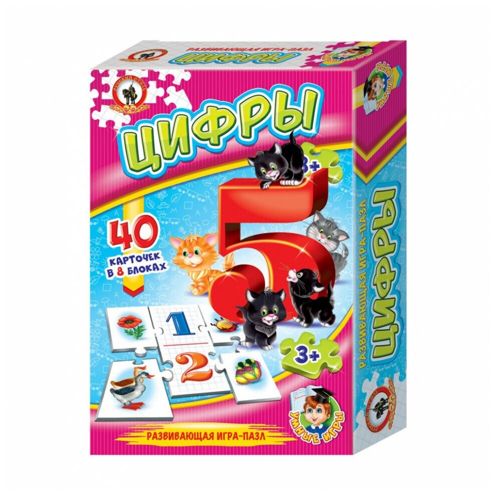 Игра "Цифры" познакомит ребенка с числами от 1 до 9. Ребенок научится порядковому и обратному счету. Правила игры просты, увлекательны и содержат несколько вариантов игр разного уровня сложности, направленных на развитие памяти, внимания и речи ребенка. Игра для детей от 3 лет и старше. Состав игры: Карточки-пазлы – 40 шт.
