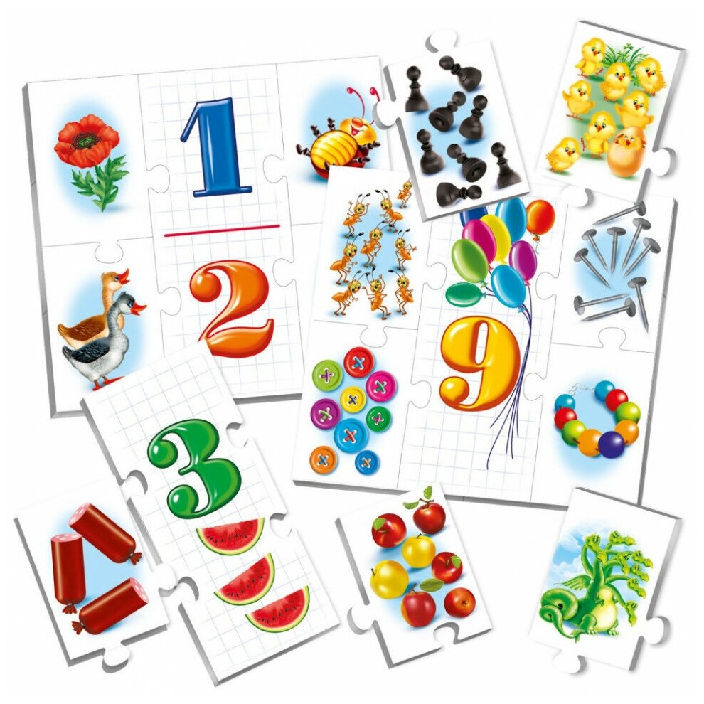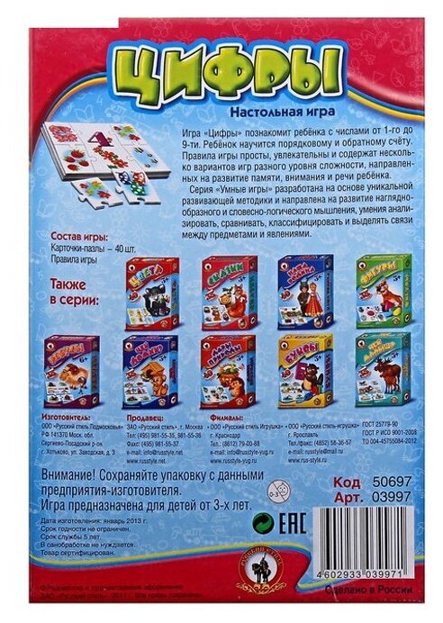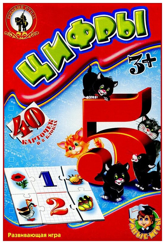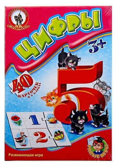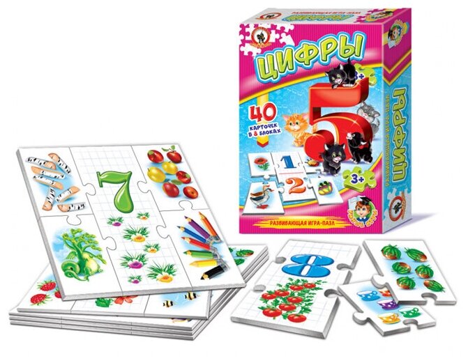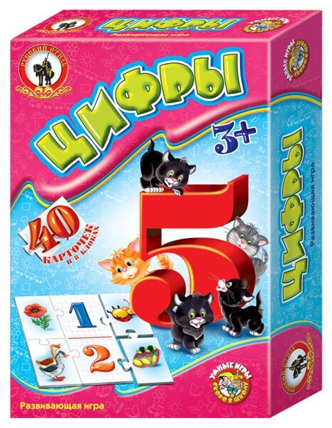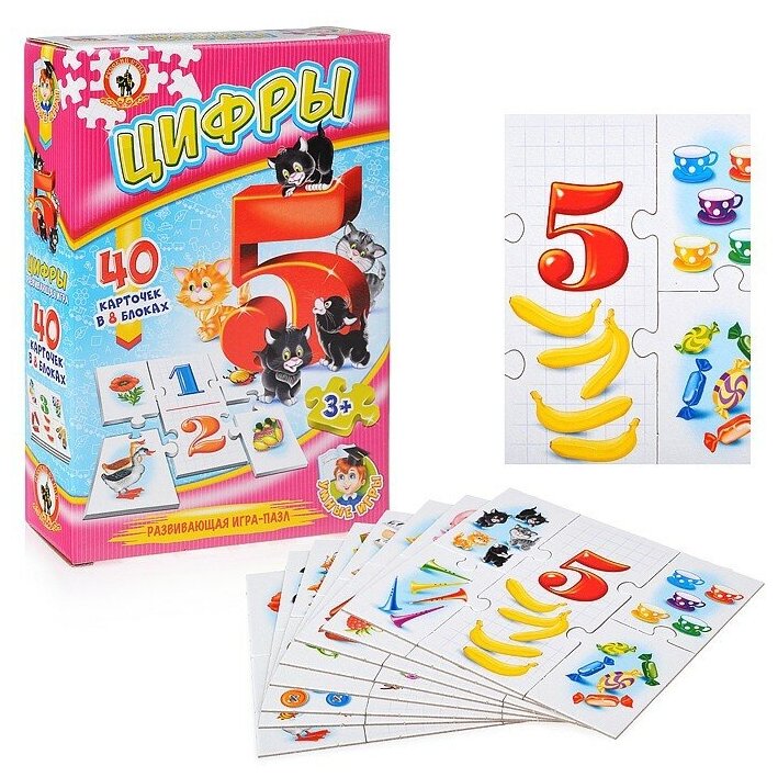 Игра "Цифры" познакомит ребенка с числами от 1 до 9. Ребенок научится порядковому и обратному счету. Правила игры просты, увлекательны и содержат несколько вариантов игр разного уровня сложности, направленных на развитие памяти, внимания и речи ребенка. Игра для детей от 3 лет и старше. Состав игры: Карточки-пазлы – 40 шт.