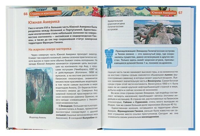 Шедевральная энциклопедия для младших и средних школьников. Неоднократно выручала и выручает ( теперь уже третьеклассницу) при подготовке к занятиям по окружающему миру, востребована, правда, значительно реже и семиклассником. Великолепно оформленная коллективом художников она притягивает внимание и четырехлетнего малыша, который, рассматривая рисунки, просит прочесть или рассказать о стране или континенте, к которому относится тот или рой рисунок. На сегодня хорошо усвоил и выделяет из все Австралию. Знает и может показать как на глобусе, так и на карте где она находится и пересказать все, что узнал о ней из этой энциклопедии. Плотная качественная белая бумага, удобный для чтения детьми шрифт, емкое изложение материала. Однозначно рекомендую к приобретению. Из данной серии приобретенытакже книги «Хищники», «Насекомые», «Динозавры», «Чудеса света», «Птицы» и «Живая природа»