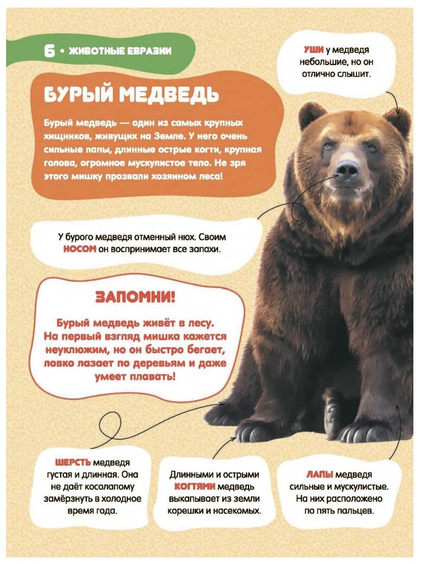 Очень нравится подача информации в виде интересной инфографики. Также плюс в том, что животные изображены крупно в настоящем своём виде! Заказала для сына 2х лет, но книга прослужит долго, актуальна и в 2 и в 5 лет! Нравится большой формат и большое количество страниц. Как раз хотела книгу о животных в энциклопедической подаче, но не перегруженной большим количеством информации!