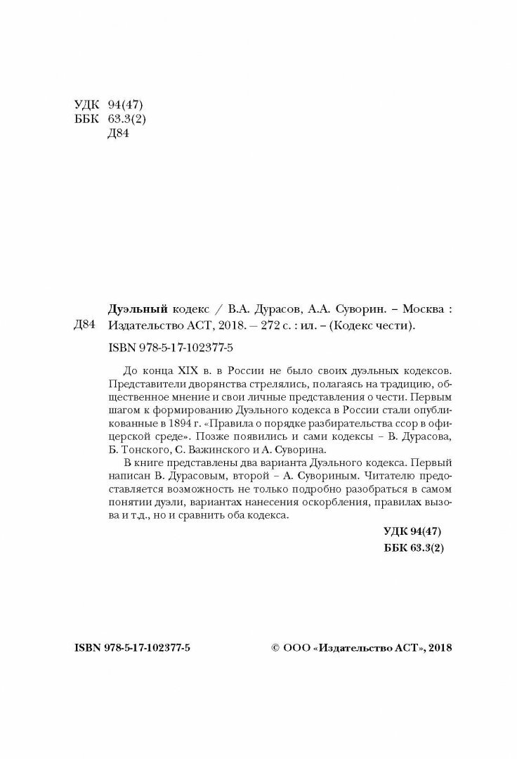 Сервис сравнения цен СкидкаГИД предлагает сравнить цены на товар «Книга: Дуэльный кодекс (Василий Дурасов); Издательство АСТ, конец XIX – начало XX веков»