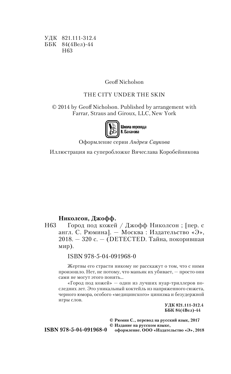 Я очень люблю серию DETECTED, в первую очередь потому что через неё я познакомилась со знаменитой трилогией Стига Ларссона. В работе же Николсона меня в первую очередь привлекла обложка и название книги, отчасти чем то напомнившей триллеры Ларссона. Сюжет здесь тоже не подкачал, я весь процесс чтения сидела в напряжении и до последних страниц не могла понять кто в итоге окажется "злом". В работе "Город под кожей" присутствует всё, что я люблю и что ищу в литературе подобного жанра: во первых закрученный и оригинальный сюжет, во вторых жестокость, и в третьих тонна черного юмора и цинизма, которые предают истории Николосона ещё больше драматизма, окрашивают её в темно-красные тона. Если нуарные триллеры это ваше, то роман определенно придется вам по вкусу. Рекомендую.