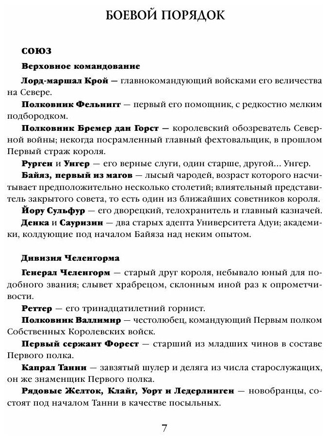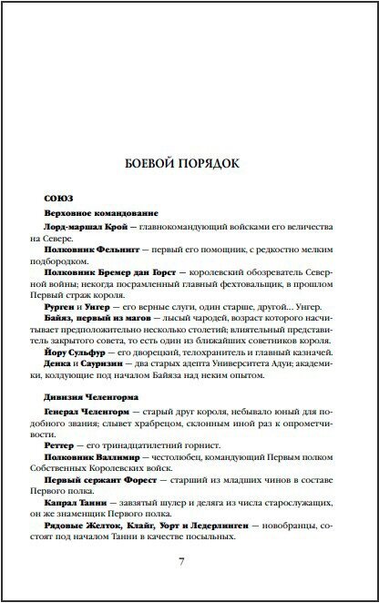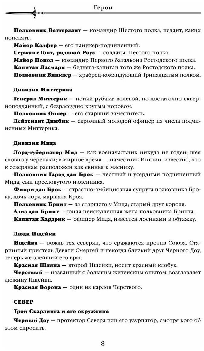 Про войну были все книги Аберкромби. Все ее ужасные истины, будь то отвага и предательство ,смешные ситуации, рутина, дурное командовани – все это мы уже читали и в оригинальной трилогии,от лица Логена и его северной компании, так и от лица Монцы Меркатто. Здесь автор просто взял несколько новых героев (и очень много старых) и из их уст рассказал свою обычную истоию – о войне ,которая очень быстро меняет судьбы героев и делает из них «героев» – ублюдков низкого пошиба.