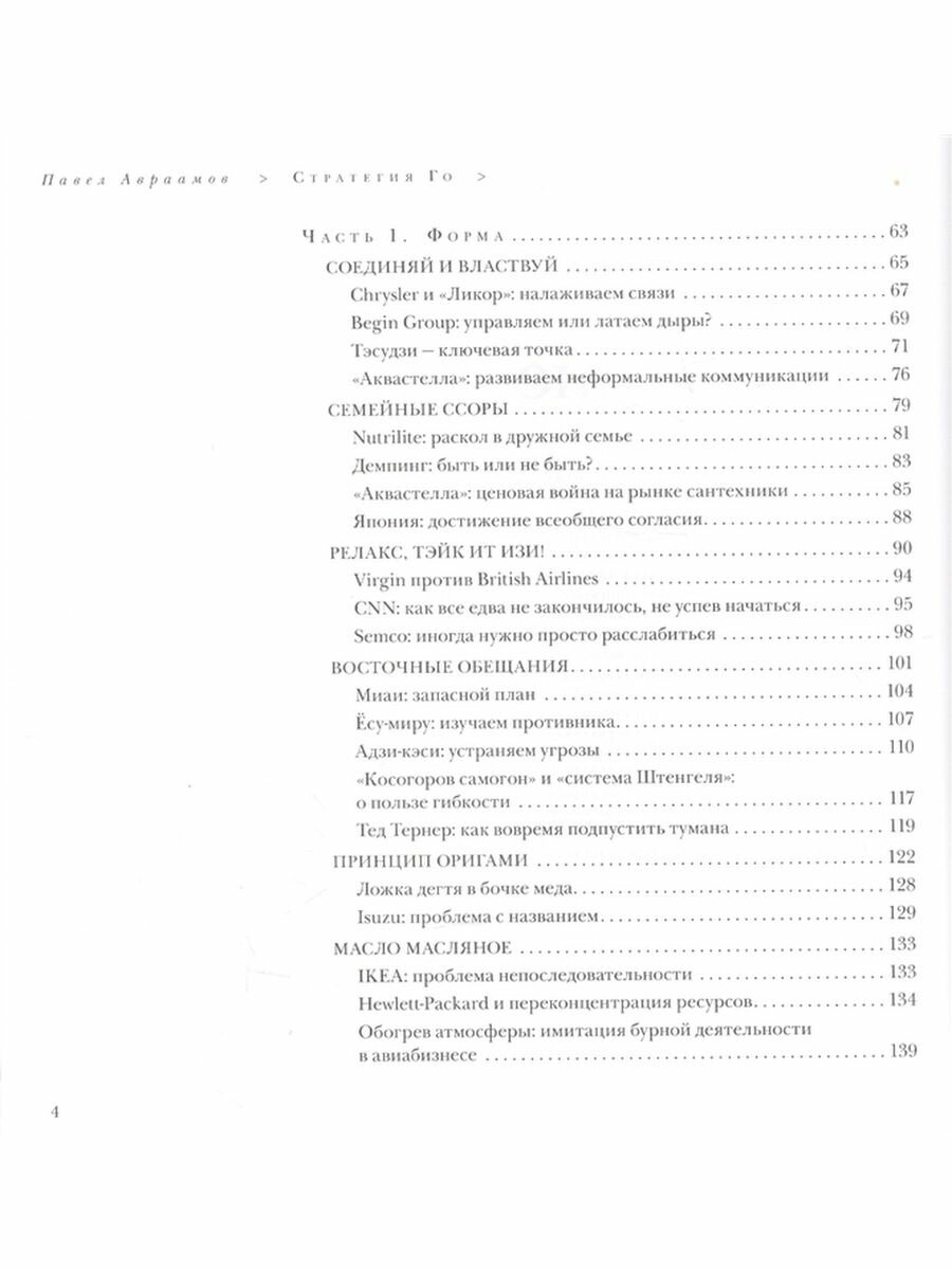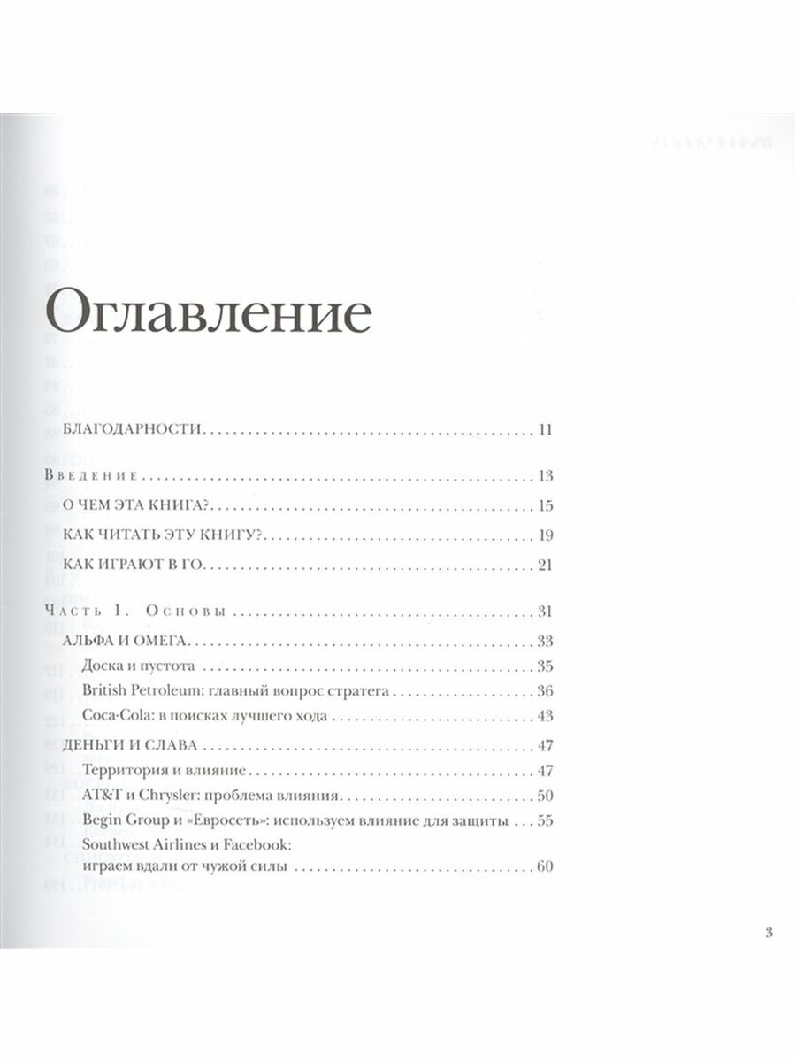 Поскольку книга продается в запакованном в пленку виде и нет возможности ее пролистать и посмотреть содержание, напишу о том, что же у нее внутри. Структура всех глав примерно одинаковая: сначала назывпется и описывается какой-то стратегический принцип игры Го, потом приводятся игровые примеры, потом на примере того или иного бизнеса показывается, как это работает в бизнесе. На самом деле не только в бизнесе. В жизни эти принципы трже работают. Обязательно ли уметь играть в Го, чтобы разобраться в том, о чем тут написано? Не обязательно. Но интерес какой-то к самой игре лучше, чтобы все-таки был. Ну потому что как можно себя заставить читать то, на что тебе все равно? В общем, для начинающих изучать Го - наверное, да. Для бизнесменов - не могу сказать, ибо я не из них. Но то, что принципы Го абсолютно применимымы в обычной жизни - это точто. Так что читайте - не пожалеете.