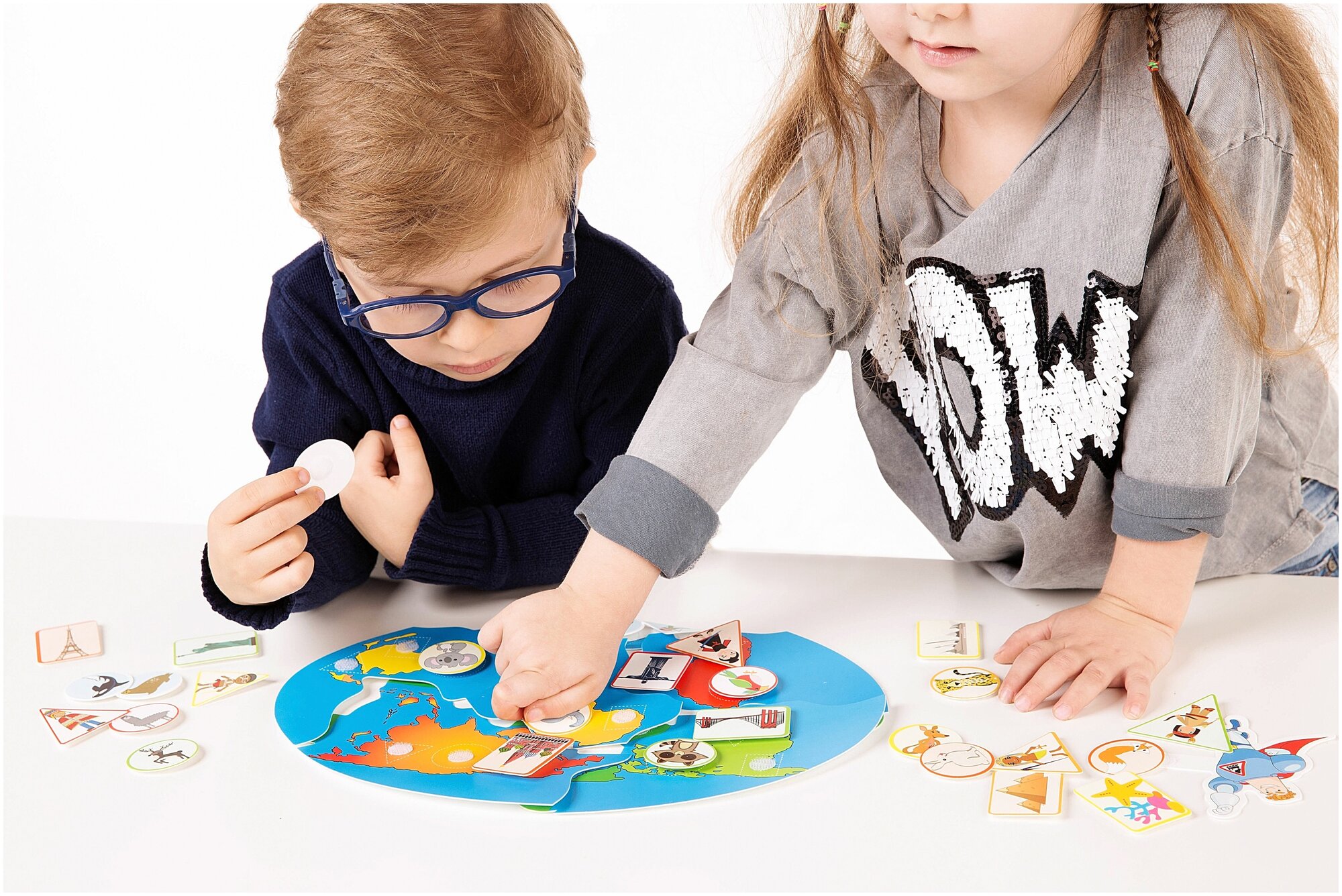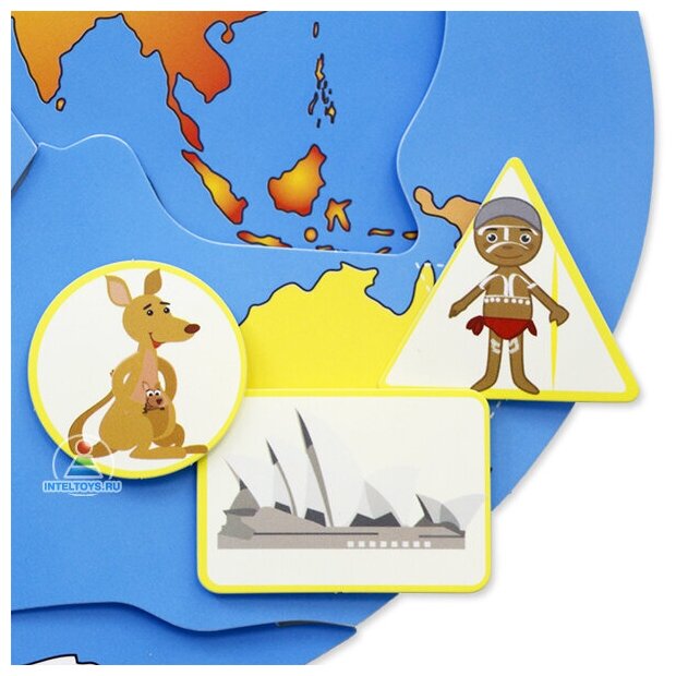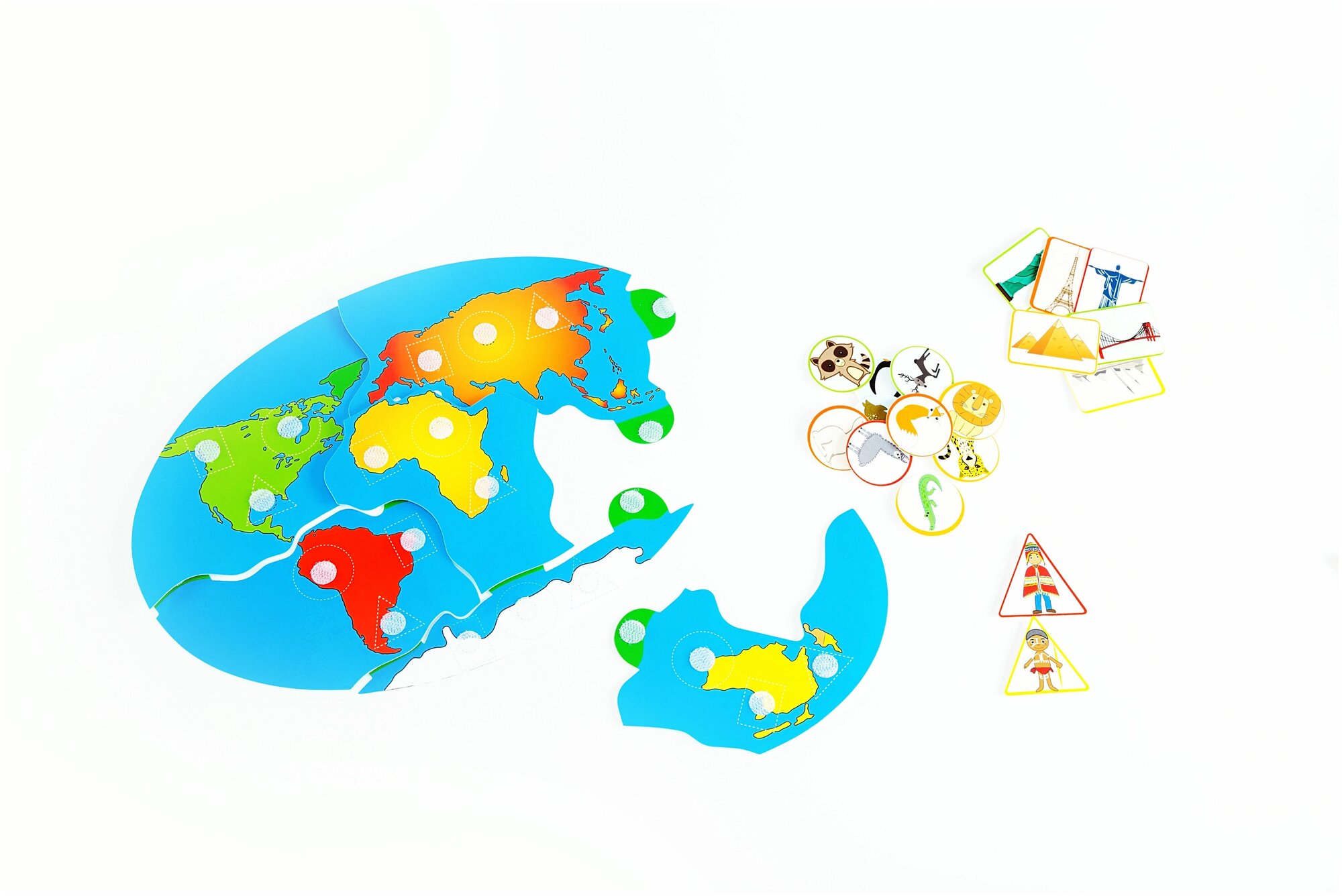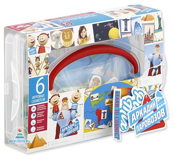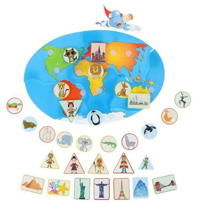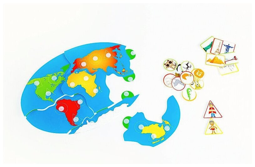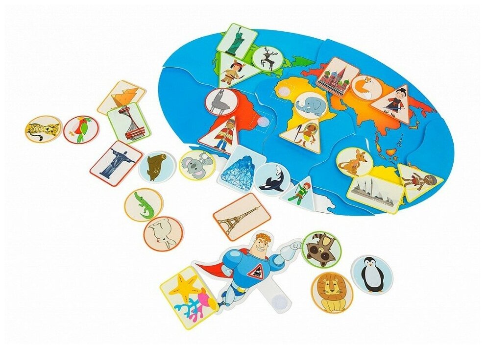 Обучающая игра -пазл липучка из серии Аркадий Паровозов состоит из 6 игровых полей-континентов. Прикрепляя на поля съёмные элементы в соответствии с условиями игры, ребенок запоминает не только названия всех континентов, но также знакомится с их жителями, животным миром и некоторыми достопримечательностями. В процессе игры тренируется логика, память, расширяется словарный запас и общий кругозор ребенка.