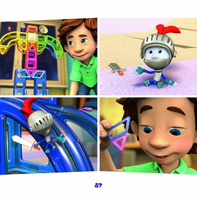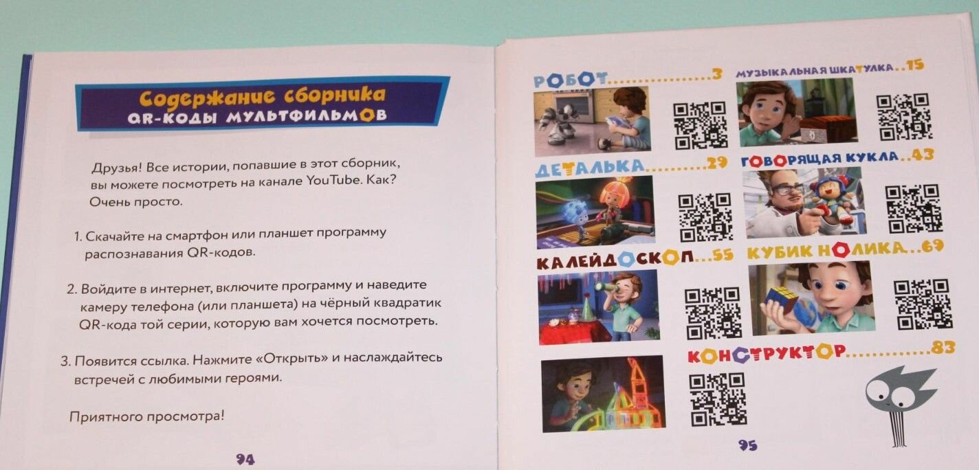 В книгу вошли истории из мультфильмов: "Робот", "Музыкальная шкатулка", "Деталька", "Говорящая кукла", "Калейдоскоп", "Кубик Нолика", "Конструктор".