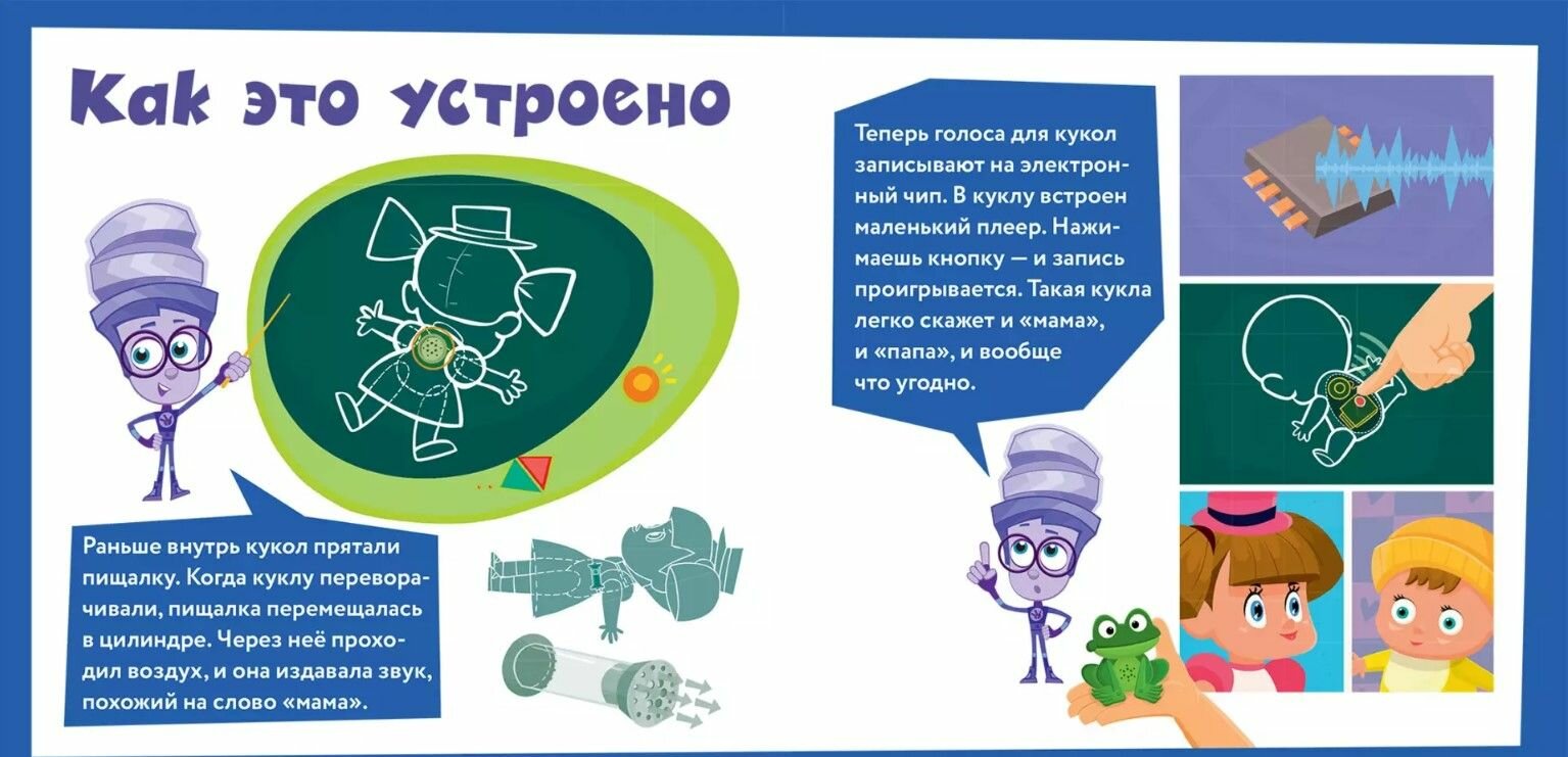 Разделы "Как это устроено" содержат уроки, посвященные устройству робота, музыкальной шкатулки, печатной платы, говорящей куклы, калейдоскопа, кубика Рубика, а также различным видам головоломок и конструкторов. В книге рассказывается, как извлекать звуки разной высоты. А еще здесь есть фиксипелка про калейдоскоп, которую можно выучить наизусть и петь вместе с фиксиками.