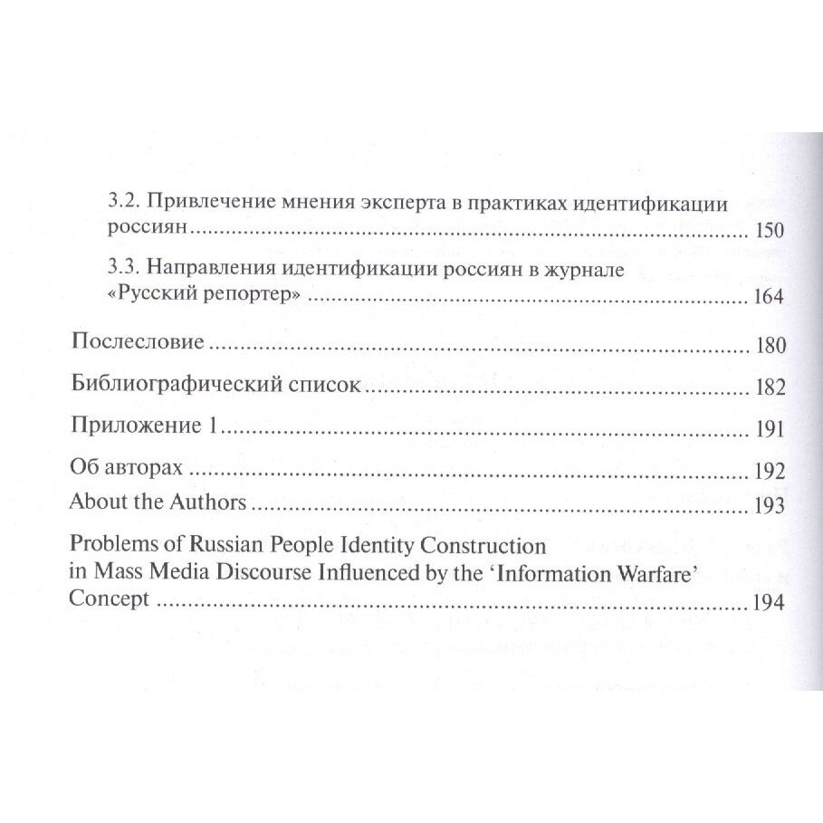 В коллективной монографии идентичность рассматривается как дискурсивный феномен, который не обладает статичностью и конструируется различными практиками идентификации. Применение методов критического дискурс-анализа к текстам СМИ, исследование практик идентификации россиян/России позволяет показать ведущие тематические направления идентификации в современном журналистском дискурсе. Особое внимание уделено дискурсивному концепту "информационная война", выявлены парадоксы его функционирования и осмыслен его мобилизационный потенциал для идентификации россиян. Исследование выполнено на материале текстов российских СМИ 2012-2017 гг.