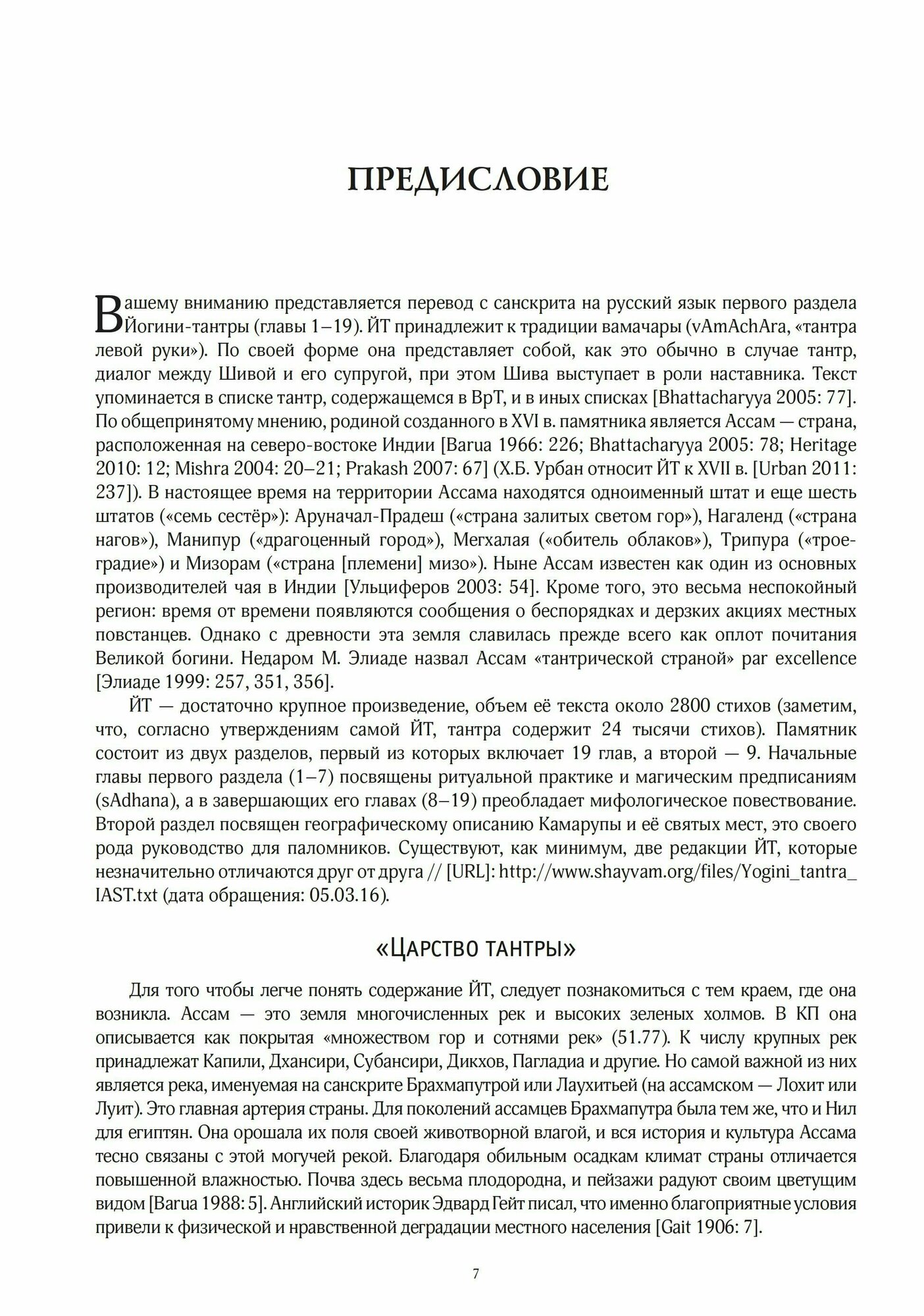 Йогини-тантра – важнейшая тантра бенгальско-ассамской традиции «левой руки», которая во многом продолжает линию появившейся на несколько веков ранее Калика-пураны. Йогини-тантра составлена в XVI в. в Ассаме, который издревле являлся центром почитания Богини. Само слово «йогини» может иметь несколько значений, выступая как одним из имен Богини, так и наименованием младших женских божественных сущностей, составляющих ее свиту, а также женщин, практикующих магию и/или йогу. Произведение состоит из двух разделов. Несколько глав первого раздела посвящены предписаниям тантрической магии. Кроме того, здесь содержатся сведения о различных видах садханы (религиозной практике тантриков), включая знаменитый обряд пяти «М». Уникальность первому разделу придает то, что значительную часть его занимает мифологическое повествование (например, рассказывается о поединке Богини с демоном Гхорой, в облике которого воплощается ее супруг Шива), что совершенно нетипично для тантр, причем многие содержащиеся здесь предания носят совершенно уникальный характер. Второй раздел Йогини-тантры представляет собой географическое описание святых мест Камарупы.