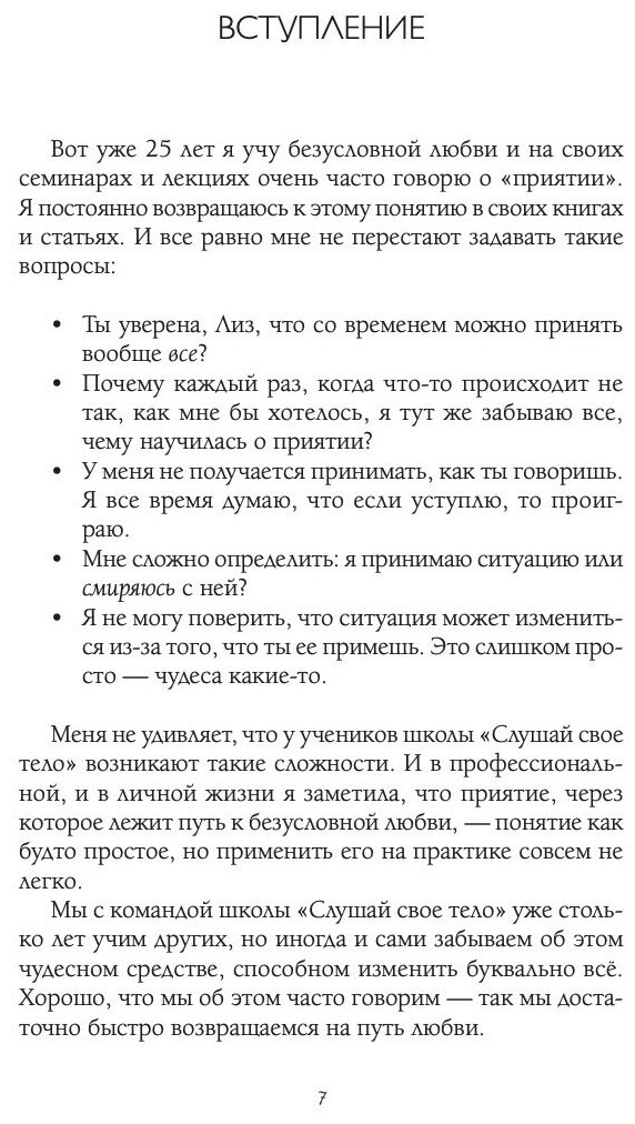 Амур, амур, амур! Приятие - это намного больше, чем просто любовь.. Первая моя книга Лиз Бурбо и, я уверена, что не последняя! Построена на диалогах с клиентами, в которых находишь мельком себя и свои проблемы. Порой читая хочется сказать, глупышка, цени себя.. Ведь со стороны всегда виднее. В ответах выражаются советы и поддержка, действительно ощущение будто находишься у психолога и оно того стоит! Можно быть хоть мега-эзотериком и исполнять какие-то желания с помощью практик, но можно прорабатывать свои травмы и идти в ногу со временем, наблюдая за чудесами в своей жизни, то как реальность меняется. Любовь, принятие и благодарность - мощные ключи к счастью. Рекомендую!