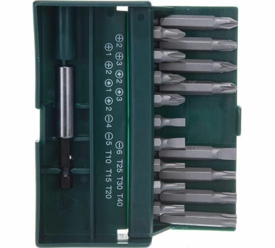 | Прочие особенности и свойства | Надежный пластиковый кейс предотвращает потерю бит и упрощает транспортировку и хранение набора,Биты изготовлены из хромованадиевой стали и закалены,Биты предназначены для работы с шурупами и винтами с использованием механизированного и ручного инструмента |
