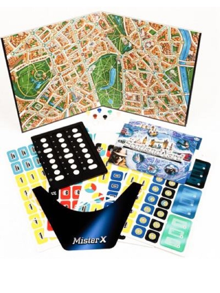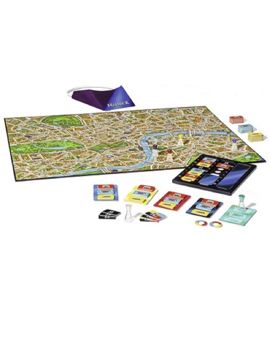 | Комплектация | игровое поле (детальная карта Лондона с маршрутами такси, автобусов и метро); планшет-журнал для фиксирования ходов (путевой лист для Мистера Икс); 6 фишек игроков; 18 стартовых карточек (жетоны для Мистера Икс, с помощью которых он может скрытно и быстро передвигаться); 127 билетов на все виды транспорта; кепка Мистера Икс; правила игры |