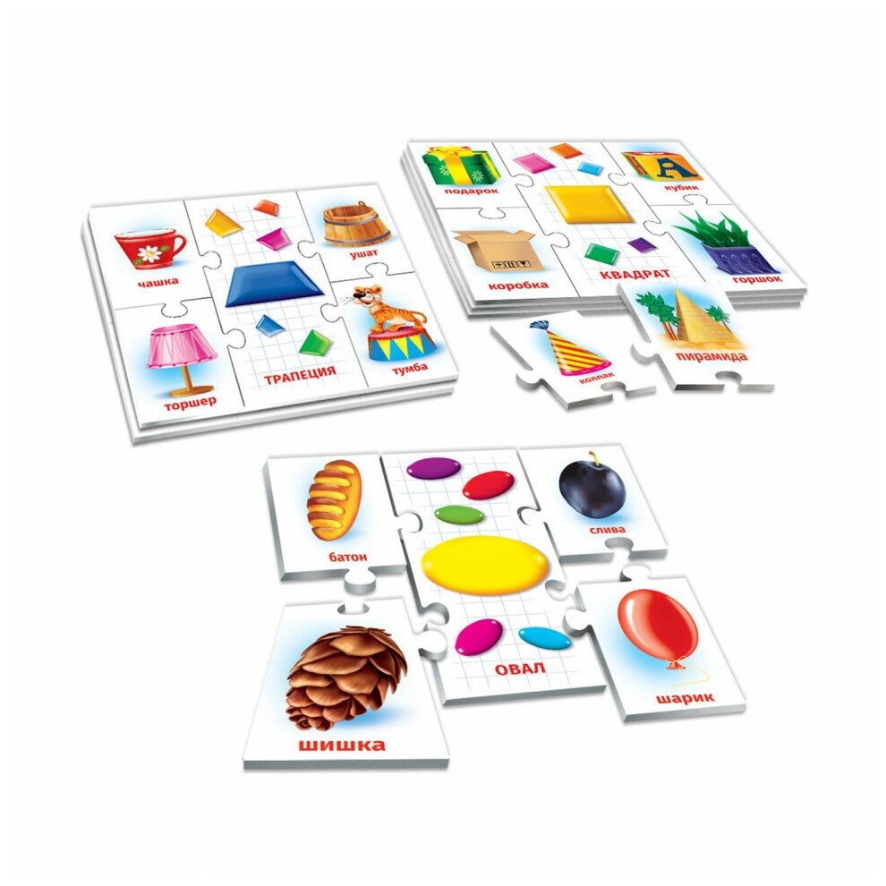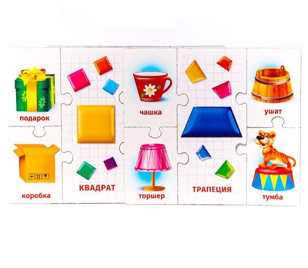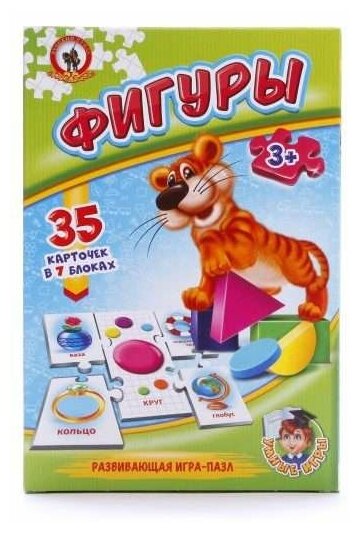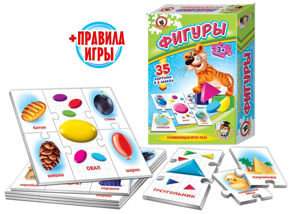 Набор из серии Умные игры предназначен для изучения семи основных геометрических форм. Каждый из блоков состоит из пяти деталей пазла, в котором центральная карточка в два раза крупнее боковых и изображает яркую геометрическую фигуру с названием, а дополнительные секции меньшего размера изображают предметы соответствующей формы. Игра развивает логику, внимание, словарный запас ребенка.