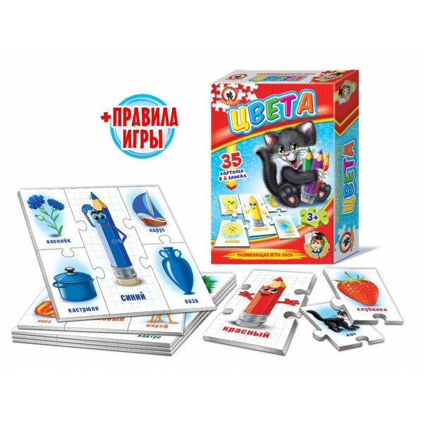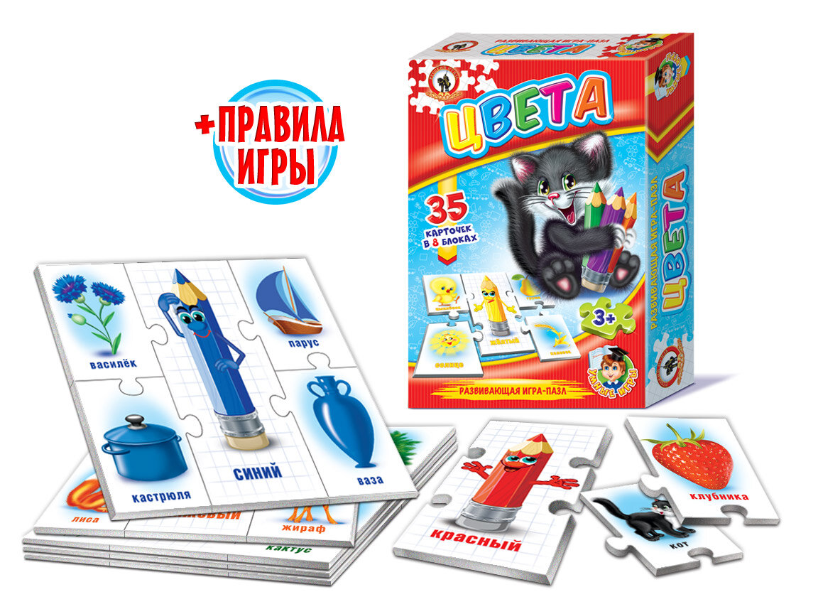 Развивающий набор карточек для детей предназначен для изучения цветов в игровой форме. Яркие блоки с изображениями разных веселых персонажей и красочных предметов очень удобны в использовании. Каждому из восьми видов соответствует по пять карточек с разными картинками одного цвета, соединяющихся по принципу пазла. Центральная картинка в два раза крупнее дополнительных и на ней написано название цвета. На изображениях, расположенных по краям, соответствующим картинке цветом указаны наименования предметов. Составляя карточки вместе, можно проговаривать дополнительно названия предметов для легкого запоминания.