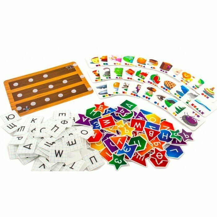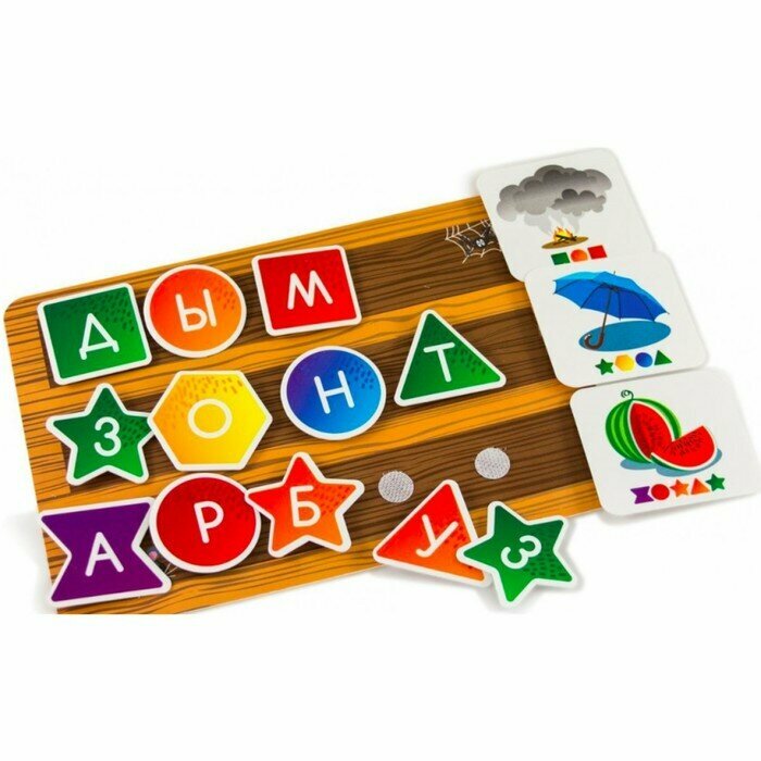 Изучаем алфавит и складываем из букв слова. Игра дает представление об азбуке и буквах, и несомненно, принесет успехи в обучении чтению. Набор состоит из игрового поля, комлпекта карточек (30 штук) с изображением предметов и заданий-подсказок, а также комлекта букв, изображенных на фото цветных геометрических фигур , и комплекта букв на фоне тетрадного листа. Игра стимулирует развите мышления, воображения, внимания, координации мелкой моторики, расширяет общий словарный запас ребенка. Выполняя игровые задания, ребенок изучает буквы и их произношение. Развивает следующие навыки: логическое мышление, восприятие формы и цвета, зрительную память, речевое общение, мелкую моторику рук. Игра комплектуется инструкцией-методическим пособием, которые не только описывает правила игры, но и предлагает сценарий её проведения, который в увлекательной форме даёт ребенку информацию об алфавите.