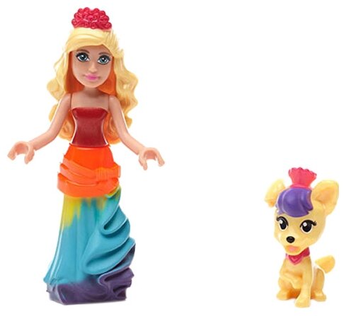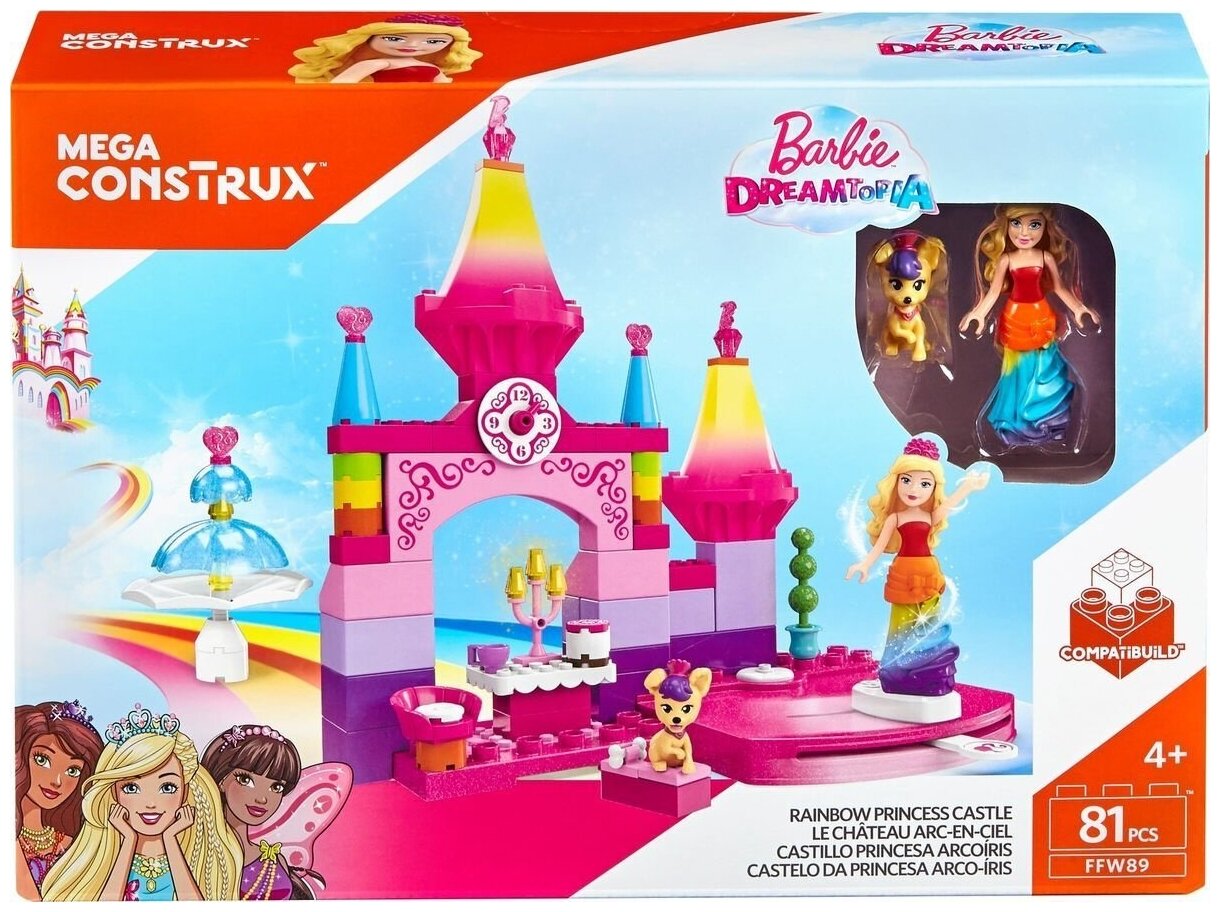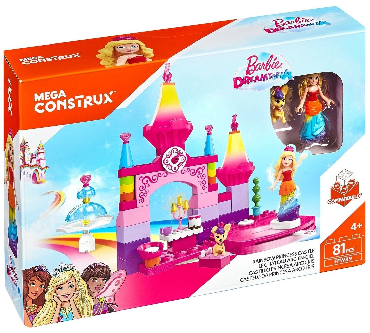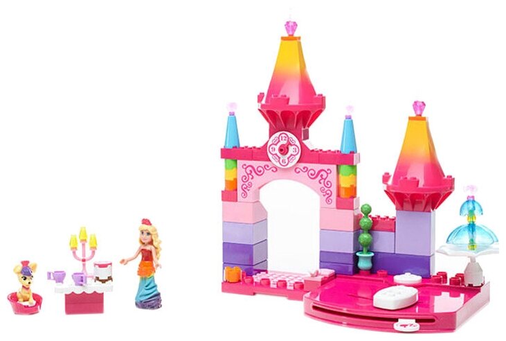 Удивительный конструктор Дримтопия от американского производителя Mega Bloks предлагает всем поклонницам прекрасных Barbie отправиться на чудесный королевский бал вместе с мини-фигуркой принцессы и ее питомцем. Из пластиковых деталей дети смогут построить роскошный замок, в котором пройдет сказочное торжество. В замке Dreamtopia имеется прекрасный фонтан, а также установлена подвижная платформа, на которую можно установить прелестную Барби и закружить в ярком танце. В комплекте Rainbow Princess Castle присутствуют элементы для создания столика и различные аксессуары: чашечки и подсвечник. Для маленького щенка в наборе представлены корзина для сна и подушка. Благодаря тому, что мини-фигурка принцессы тоже имеет подвижные детали, девочки смогут придавать ей различные позы для того, чтобы лучше продемонстрировать ее радужный наряд.