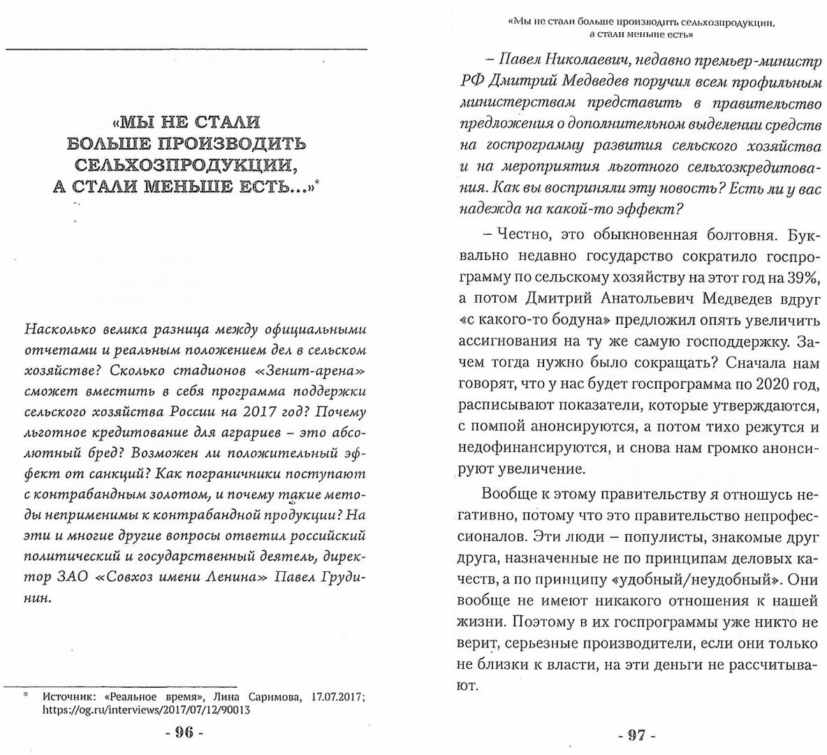 На рубеже 2017-2018 годов, Павел Грудинин сенсационно ворвался в большую политику. Настоящее издание - это шанс для читателя познакомиться с феноменом известного российского агрария, узнать его мнение о важнейших социальных, политических, экономических вопросах, получить представление о том, в каком направлении будет развиваться наша страна. В книгу вошли интервью и выступления последних лет, в которых Павел Грудинин откровенно отвечает на острые вопросы, волнующие большинство российских граждан. Их тематика весьма обширна: от обсуждения проблем в сельском хозяйстве и экономике до социальных и внешнеполитических вопросов. Санкции, импортозамещение, коррупция, социальное неравенство, карьеризм, патриотизм - вот лишь некоторые из тем.