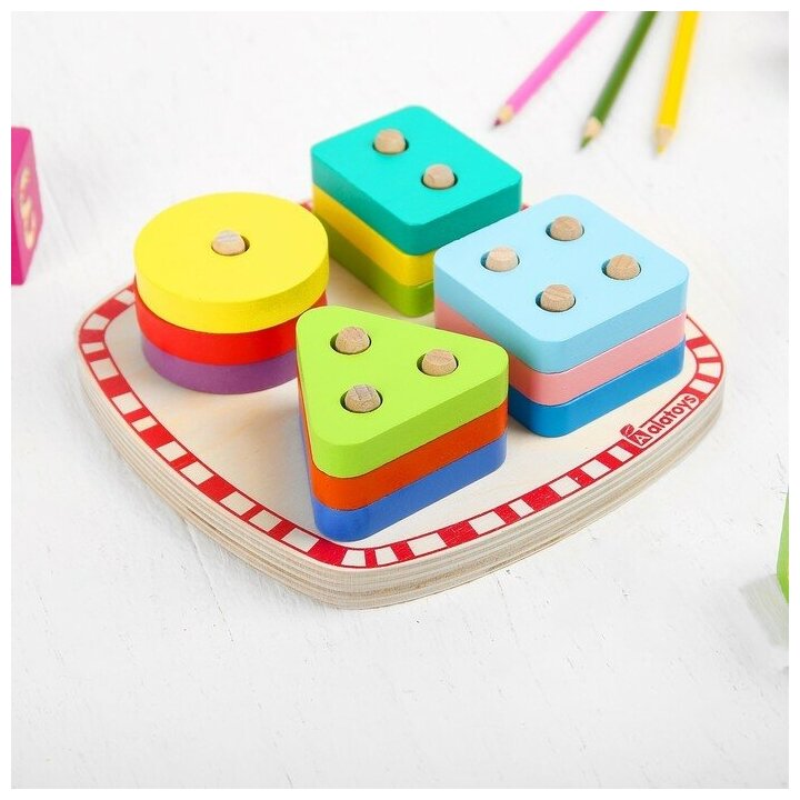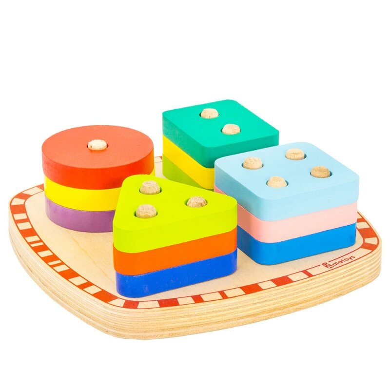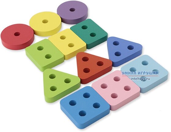 - задача малыша: насадить фигурные детали на деревянные штырьки-направляющие, руководствуясь формами;