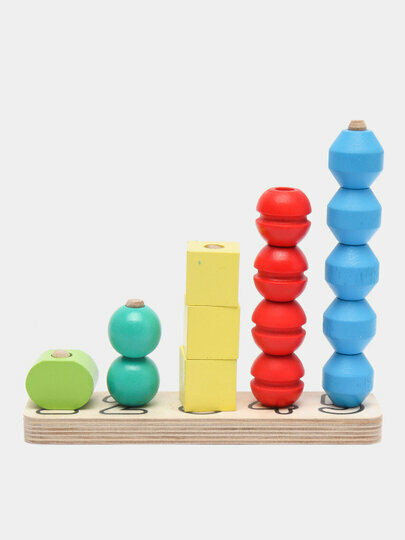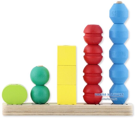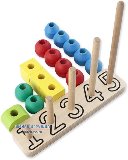 - на деревянном основании стержни обозначены цифрами от 1 до 5 с соответственным числом нанизываемых деталей;