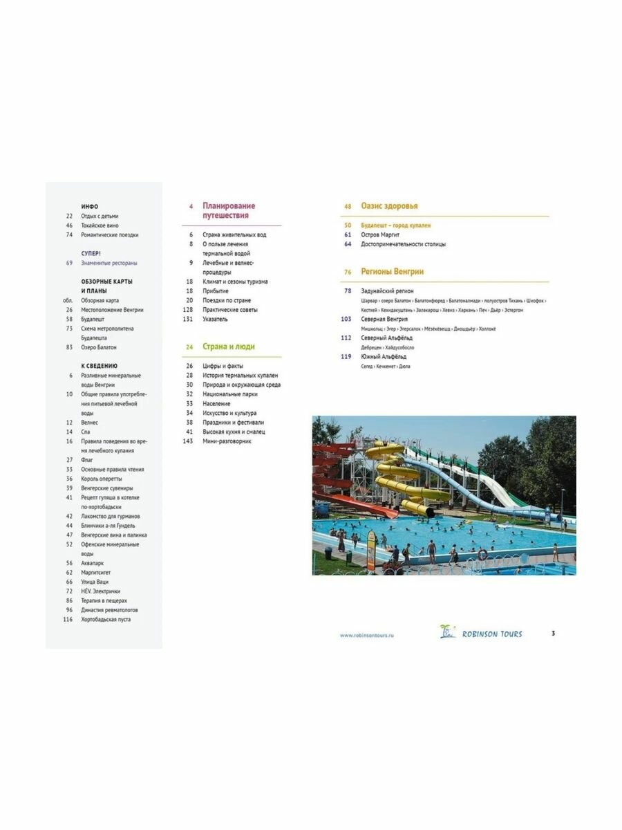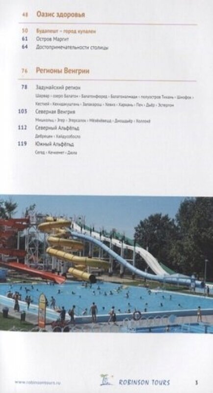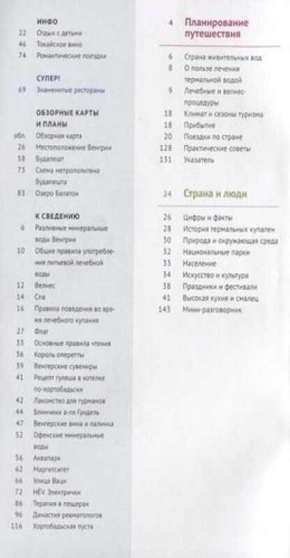Разделы, которые помогут выбрать подготовиться к путешествию, а именно: краткую историю термальных курортов Венгрии, познакомитесь с лечебными и спа-процедурами, которые предоставляются в разных уголках страны, составом воды большинства источников и, конечно же, узнаете о главных достопримечательностях, осмотр которых нужно включить в культурную программу. Разделы климат, транспорт помогут выбрать лучшее время для путешествия, а информация о гостиницах и ресторанах - сориентироваться во всем многообразии предложений.