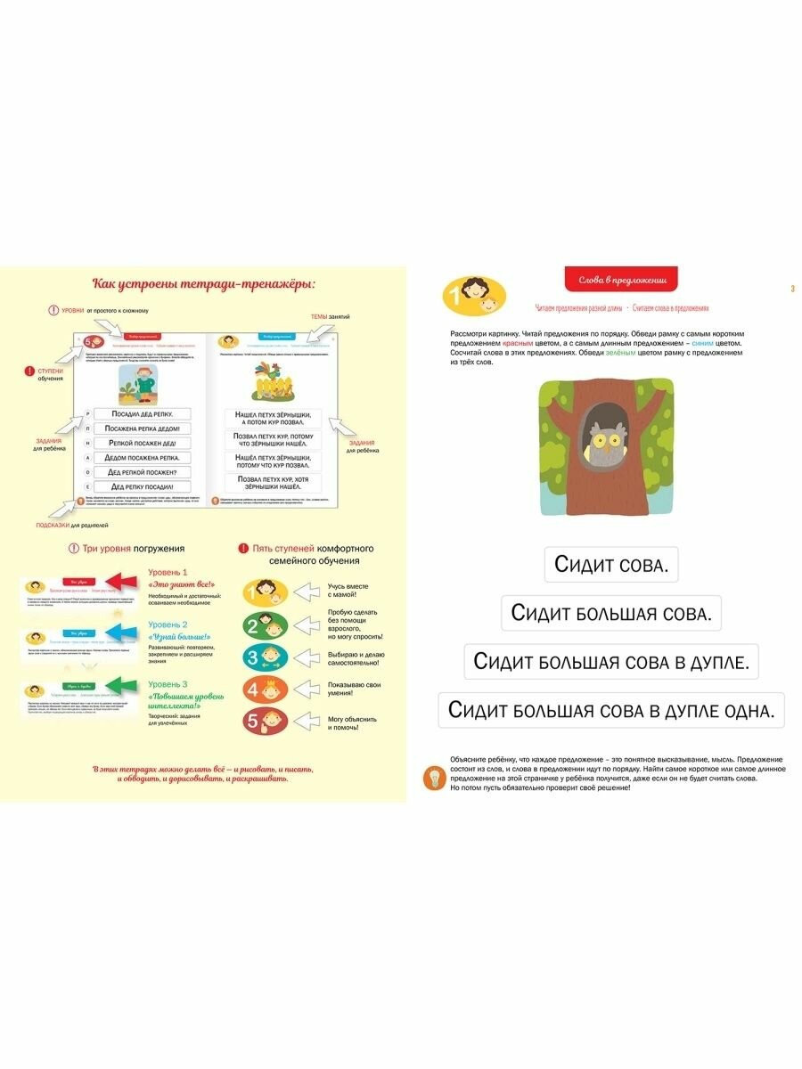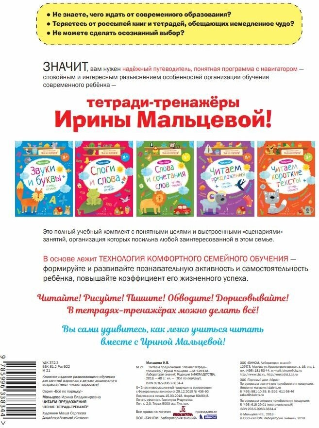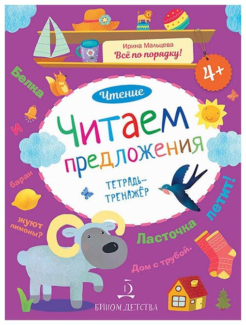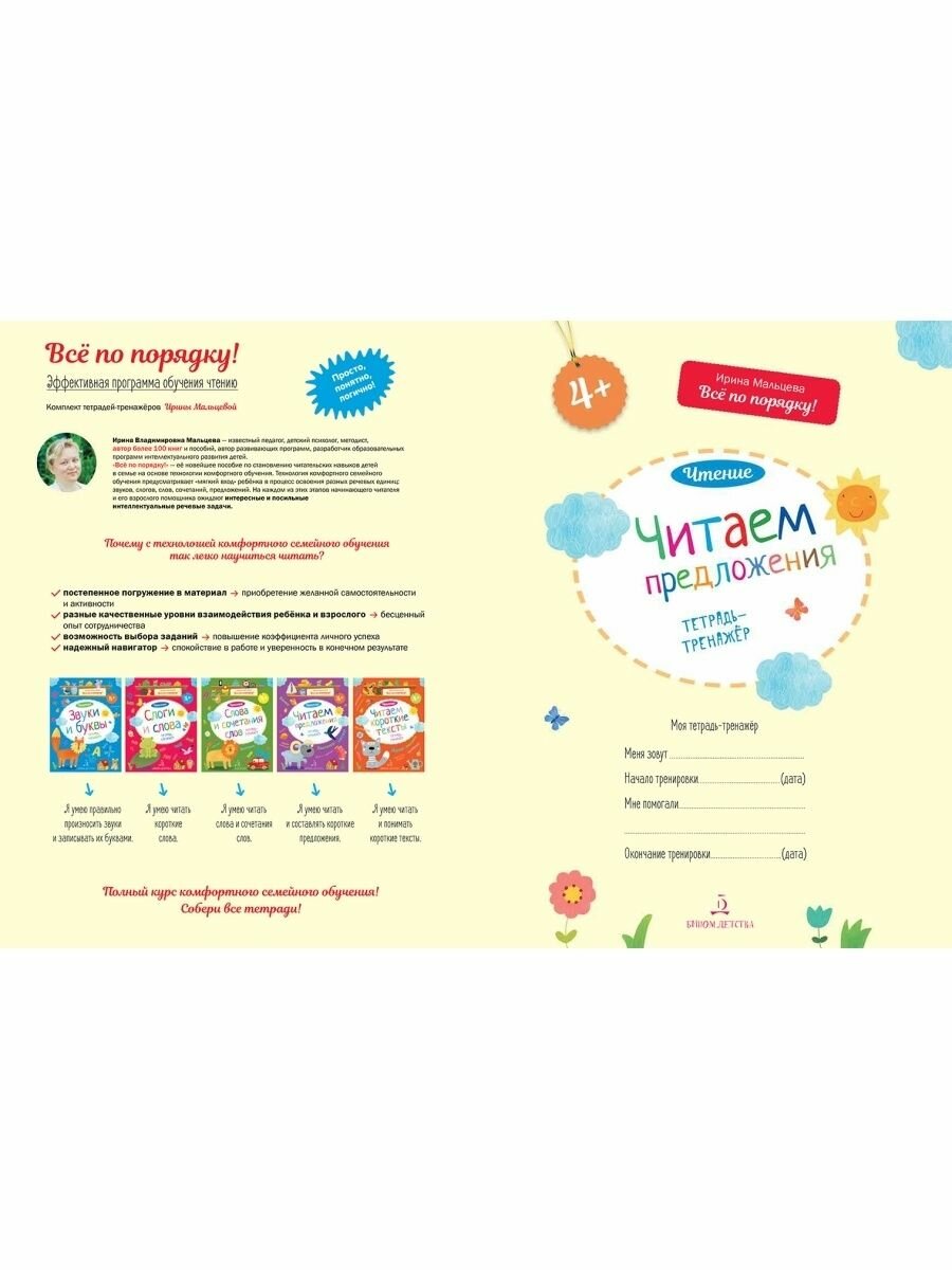 Это одна тетрадь из комплекта "Всё по порядку!" Эффективная программа обучения чтению. В тетрадке представлены задания на чтение предложений разной длины, на умения подбирать к предложениям подходящие по смыслу слова и сочетания слов. Есть задания на составления предложений. Детям предлагается рассмотреть картинку, прочитать предложения, поставить знаки препинания, выбрать нужные предложения к картинкам, вставить подходящее пропущенное слово. Тренажёр интересный, задания разнообразные. С книгами И.В. Мальцевой использую с большим успехов в работе с детками старшего дошкольного возраста.