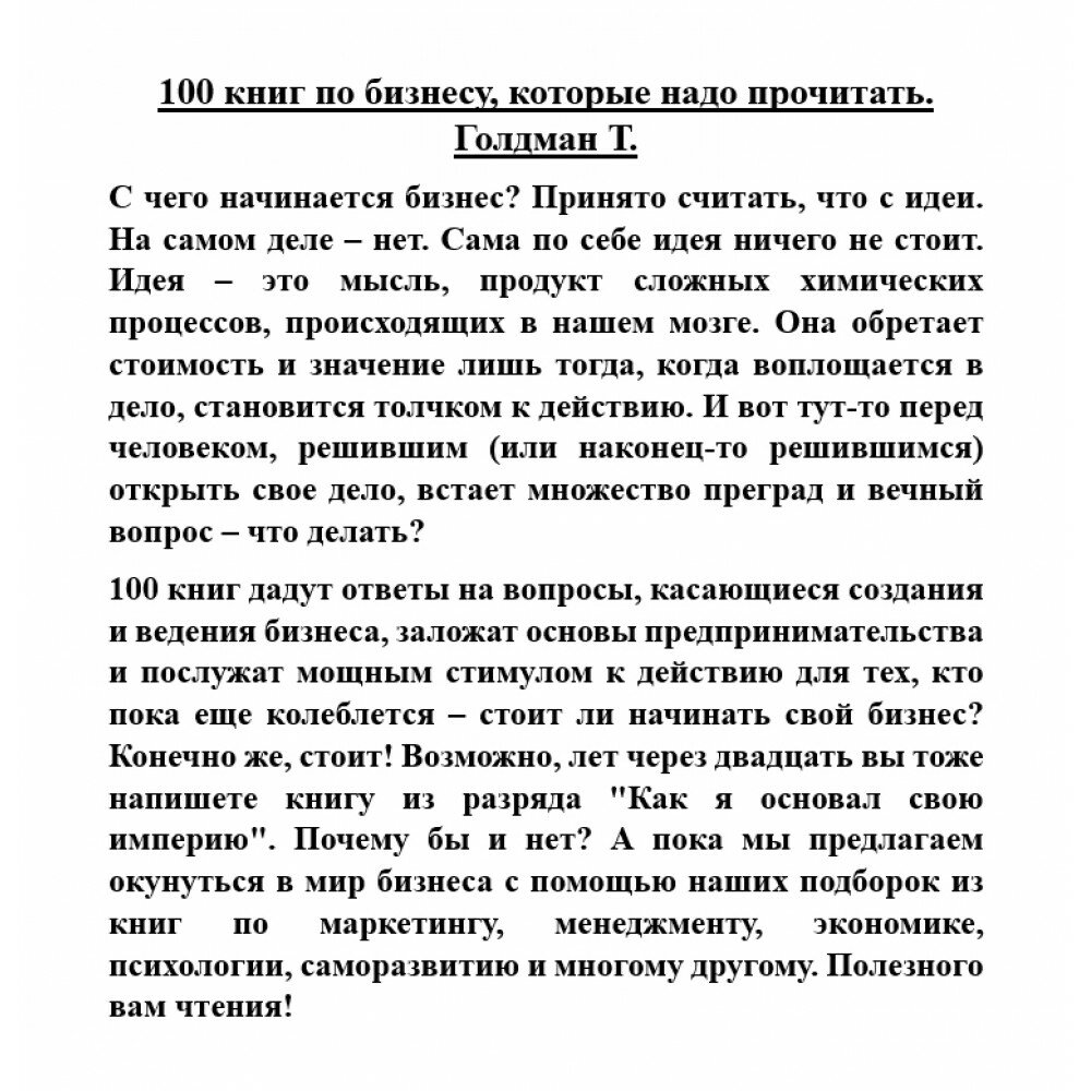 Список внушительный и актуальный на сегодняшний день. Включает, в том числе, достойные произведения российских авторов. Книга разделена по темам: психология, развитие личности, экономика и прочие. Дано описание каждой книги и основные тезисы. По-настоящему полезен сам список, но чтобы не раствориться в большом объёме информации - помогает определить приоритеты. В целом, стоит своих денег.