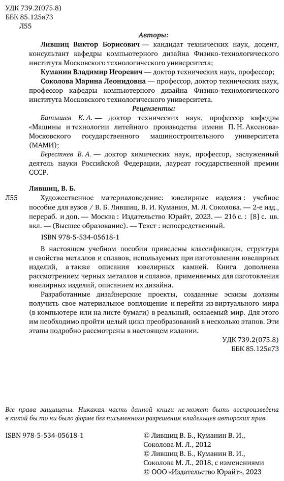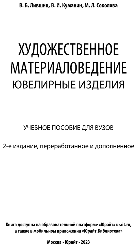 Художественное материаловедение. Ювелирные изделия (Лившиц Виктор Борисович; Куманин Владимир Игоревич; Соколова Марина Леонидовна); ЮРАЙТ, 2019