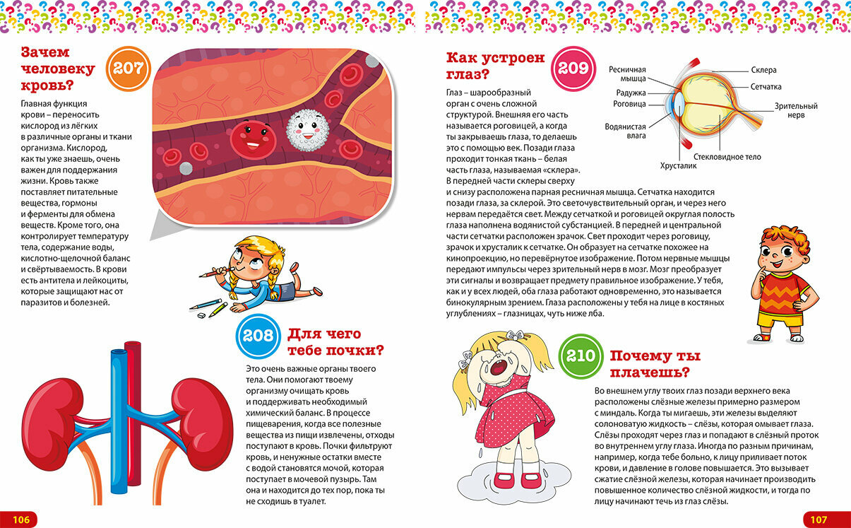 Нам эту энциклопедию подарили на день рождения. Сыну 5 лет, поэтому считаю, что на этот возраст и младше книга самое то, И собственно поэтому я бы поставила на книге возраст 0+, но не 6+. Ибо энциклопедия реально совсем детская: создана она именно в формате вопрос-ответ, вопросы не просты, а такие как любят задавать дети в возрасте 3-5 лет: почему это так, а это вот так. Плюс оформление самой книги детское: везде на страницах улыбающиеся детки, улыбающиеся животные и неодушевленные предметы. По содержанию энциклопедия охватывает такие вопросы как: Вселенная, вопросы нашей планеты, животный мир, растительный мир, человек и его тело. На каждой странице по 2 вопроса и ответы к ним. К каждому ответу представлена своя иллюстрация.