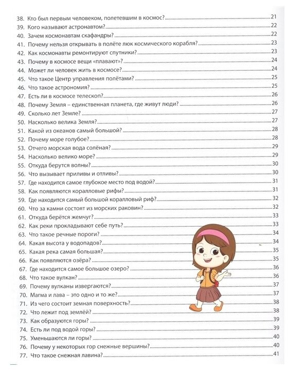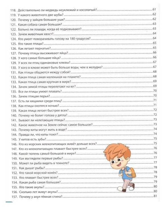 Энциклопедия в твердом переплете, большого формата, глянцевая и яркая обложка - все это конечно же привлечет ребенка! Страницы белоснежные, глянцевые, очень приятно листать книгу. Содержит 300 вопросов и на последних страницах они все перечислены по номерам- это очень удобно, может быть кто-то не захочет читать все подряд, но увидев интересующую его тему в перечне, откроет нужную страницу. В общем книга замечательная, мне, взрослому человеку, и то захотелось прочитать ответы на некоторые вопросы) Рекомендую!