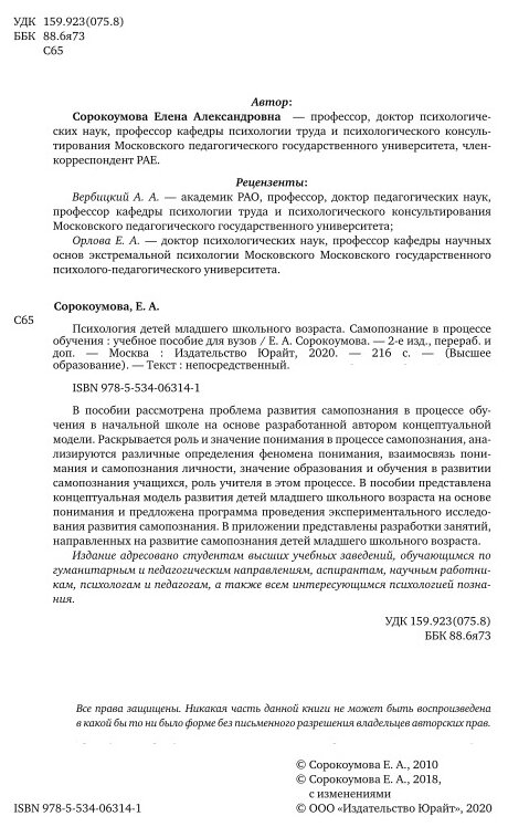 Психология детей младшего школьного возраста. Самопознание в процессе обучения (Елена Александровна Сорокоумова); ЮРАЙТ, 2018