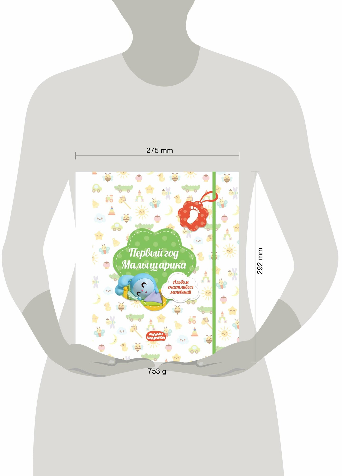О проекте «Малышарики» - это обучающий и развивающий мультфильм для малышей - продолжение знаменитого проекта «Смешарики», который стал не менее популярным у ребят от 0 до 4 лет. Каждый мультфильм на канале Youtube, на который подписано около 300 тысяч человек, имеет десятки и сотни тысяч просмотров и транслируется на телеканалах «Карусель» и «Мульт». Жанр Альбом для фотографий и записей. О книге «Первый год Малышарика. Альбом счастливых мгновений» - это красочный и яркий альбом, куда родители могут вклеивать фотографии своего ребенка, а также записывать всё, что с ним происходит. Как он родился, кто придумал ему имя, как менялся его вес и рост на протяжении первого года, как ласково зовут его бабушки и дедушки, кому он первому улыбнулся, когда сел и когда пошел. Любимые и узнаваемые персонажи мультфильма подскажут, что лучше всего запечатлеть в этом нежном возрасте и как делать качественные фотографии, выстраивать кадр, интересно фотографировать малыша, как необычно оформить и подписать их и как не упустить ни одного важного события. Особенности Альбом «Первый год Малышарика» выполнен в стилистике мультфильма, преимущественно в пастельных тонах, рекомендованных детскими психологами. Кроме того, он выходит в двух оформлениях: розовом и салатовом, на пружине, а внутри милые наклейки с изображениями персонажей любимого сериала.