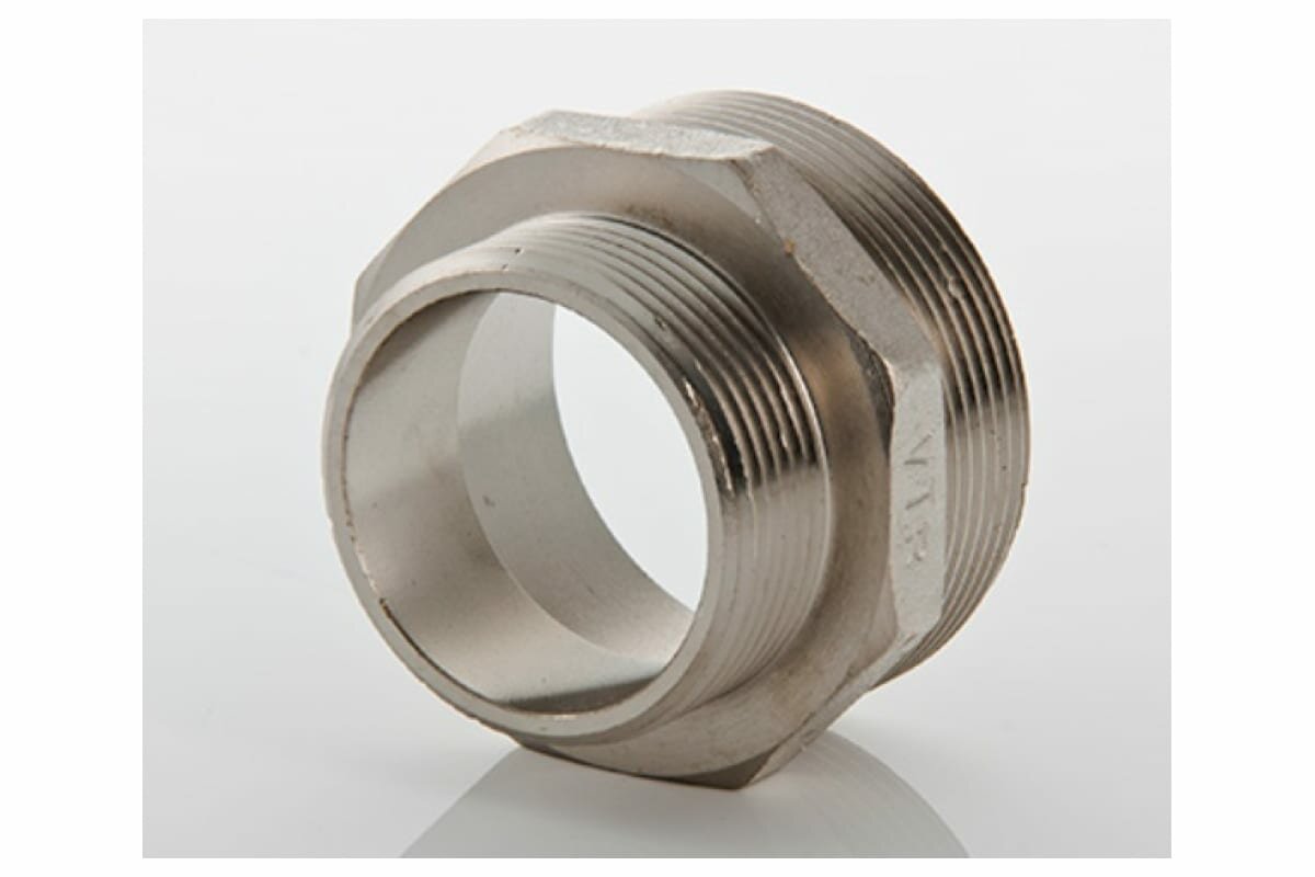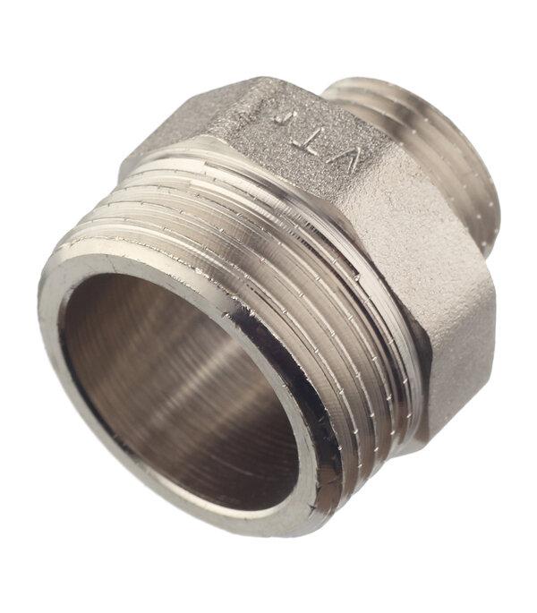 Резьбовой фитинг – ниппель переходной. Обеспечивает соединение элементов трубопровода разного диаметра. Выполнен из латуни CW617N (евростандарт EN12165) горячим штампованием с последующим никелированием. Резьба обоих патрубков – наружная (тип – цилиндрическая трубная, ГОСТ 6357, ISO 228, EN10226). Насечки на резьбе способствуют удержанию герметизирующего материала (например, сантехнического льна). Наличие шестигранного (под гаечный ключ) участка корпуса облегчает монтаж соединения. Максимальная температура использования ниппеля составляет 250 градусов Цельсия (при максимальном рабочем давлении 2,7/1,7 бар – для моделей условным диаметром до/более 1”).