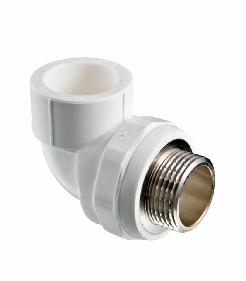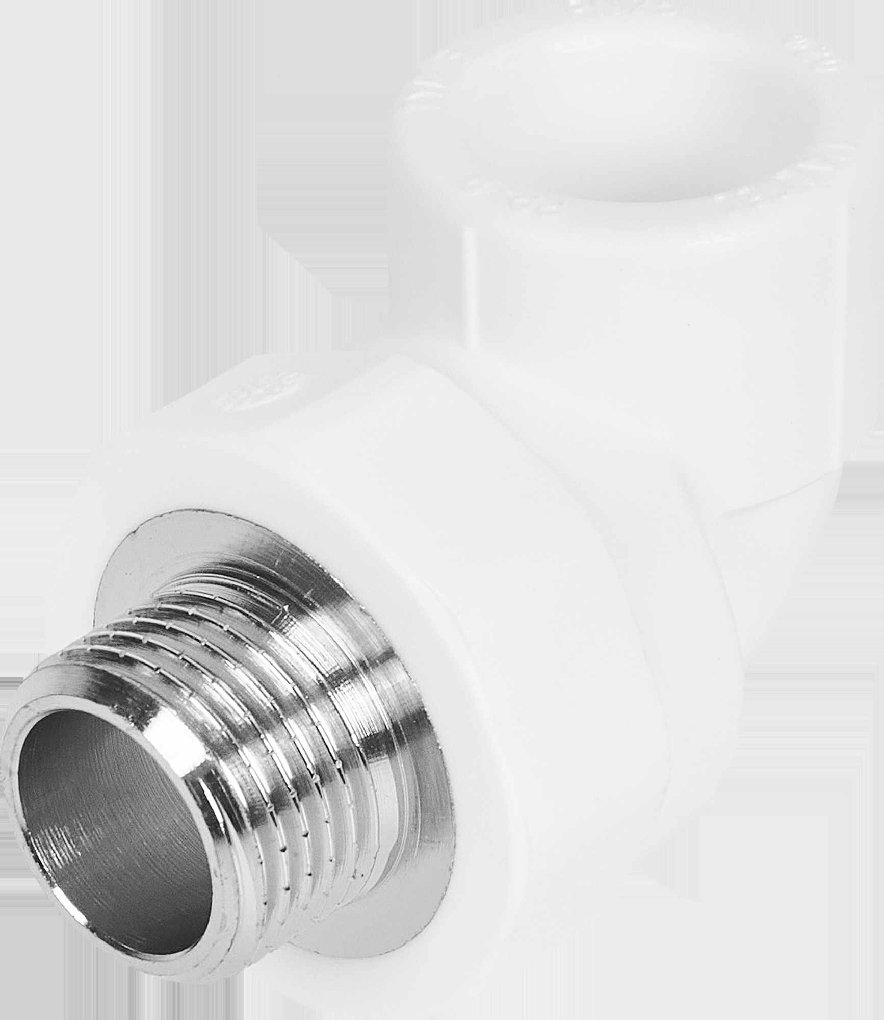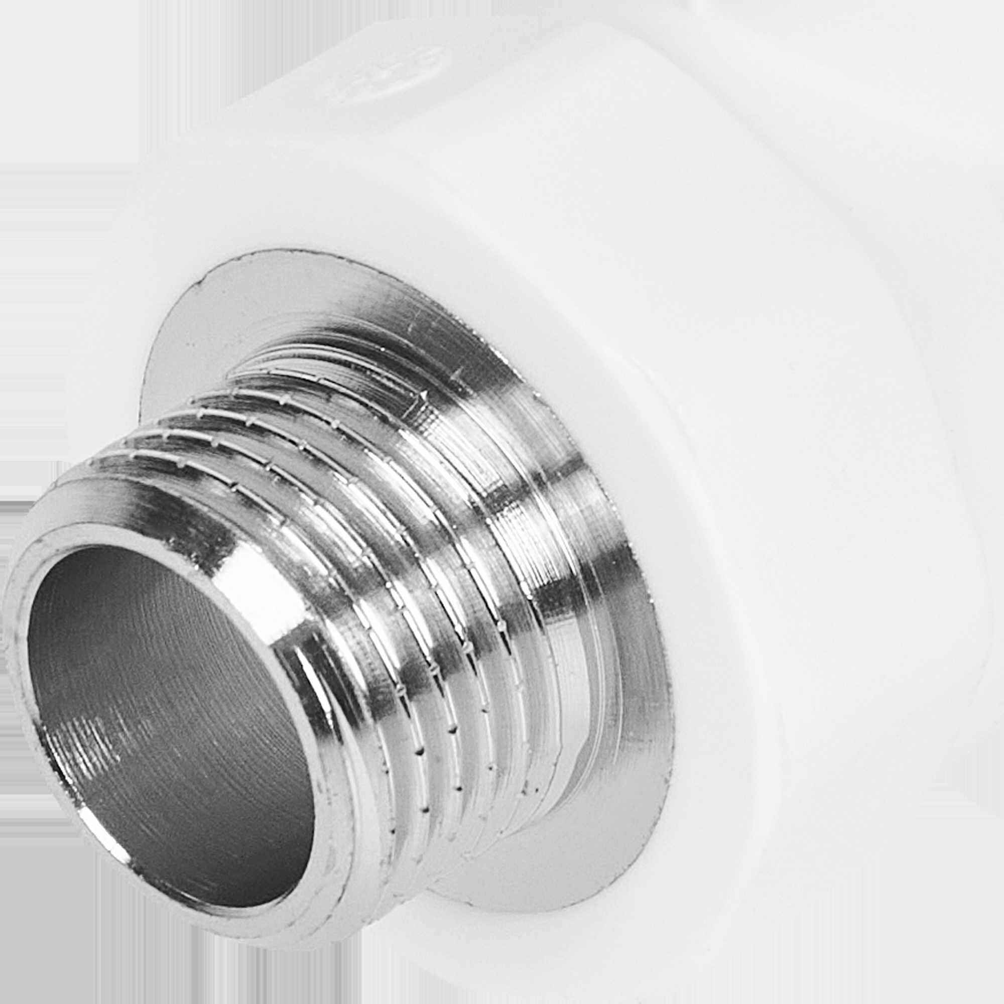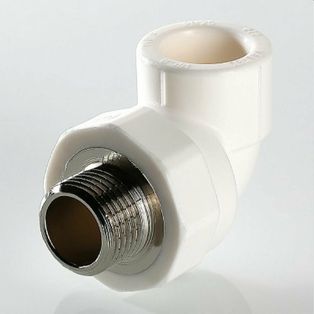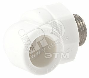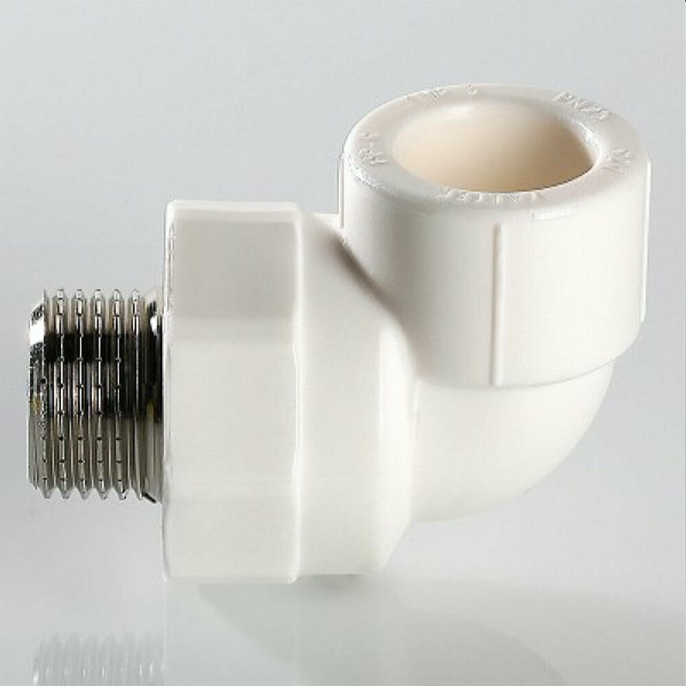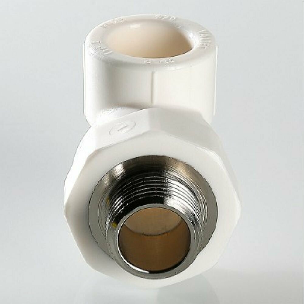Двухсторонний металлопластиковый фитинг для соединения под углом 90 градусов друг к другу полипропиленового трубопровода и компонента инженерной системы с резьбовым подключением, 20 х 1/2 . Резьба фитинга - наружная трубная, по ГОСТу 6357.