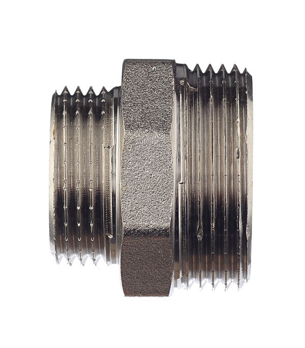 Резьбовой фитинг – ниппель переходной. Обеспечивает соединение элементов трубопровода разного диаметра. Выполнен из латуни CW617N (евростандарт EN12165) горячим штампованием с последующим никелированием. Резьба обоих патрубков – наружная (тип – цилиндрическая трубная, ГОСТ 6357, ISO 228, EN10226). Насечки на резьбе способствуют удержанию герметизирующего материала (например, сантехнического льна). Наличие шестигранного (под гаечный ключ) участка корпуса облегчает монтаж соединения. Максимальная температура использования ниппеля составляет 250 градусов Цельсия (при максимальном рабочем давлении 2,7/1,7 бар – для моделей условным диаметром до/более 1”).