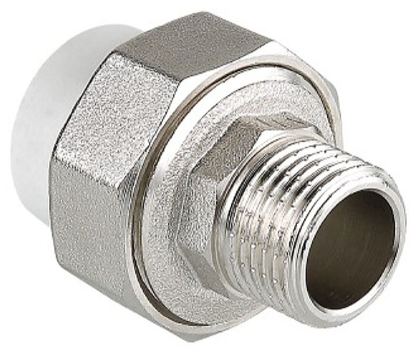Металлопластиковый фитинг для создания разъемного, с использованием накидной гайки, соединения полипропиленового трубопровода с трубопроводом или арматурой из других материалов.