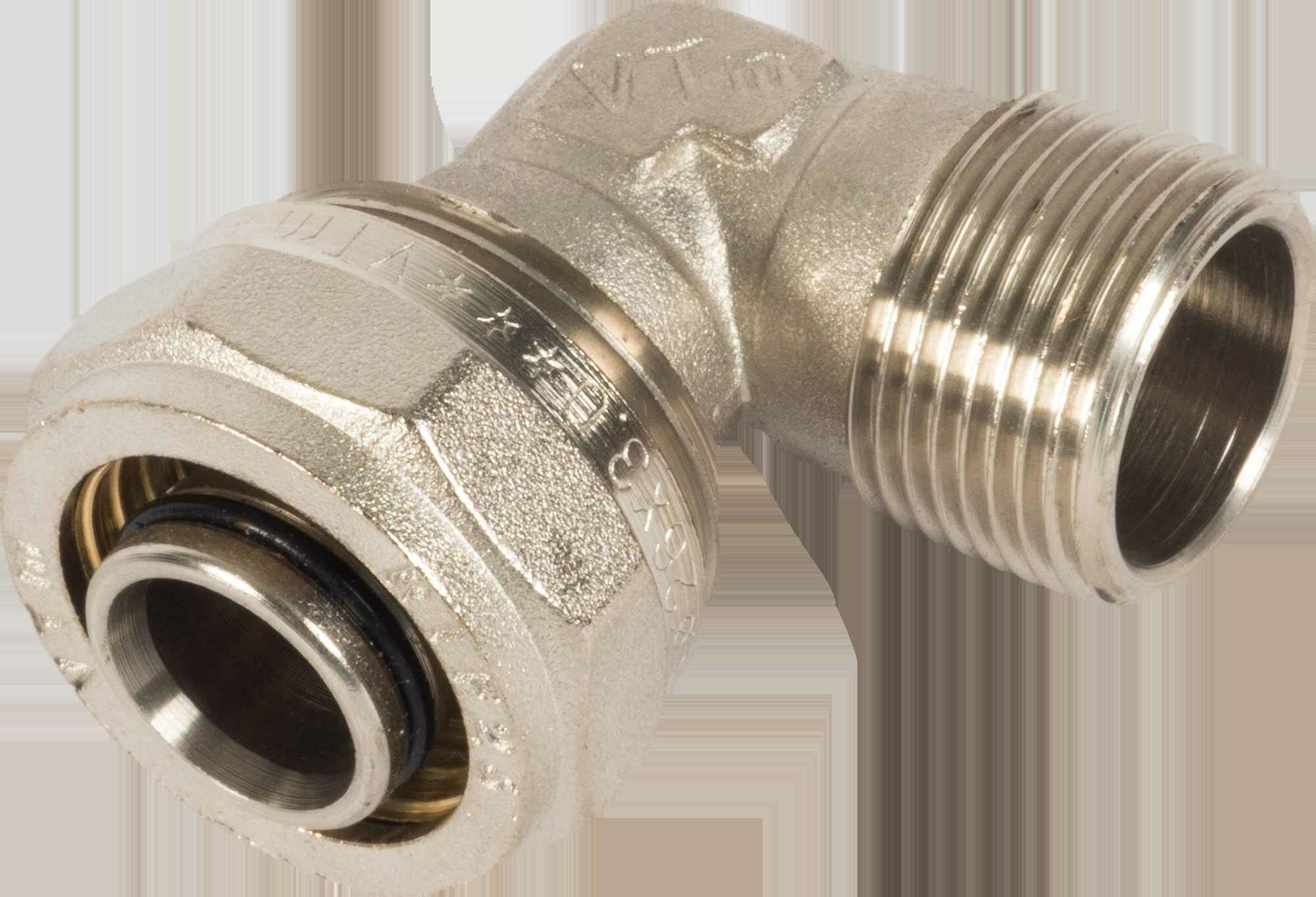 Угловой латунный никелированный обжимной фитинг для соединения металлополимерного трубопровода с компонентом системы, имеющим резьбовое подключение, 26 х 3/4 . Резьба фитинга - наружная трубная по ГОСТу 6357. Cерия VTm.353.N