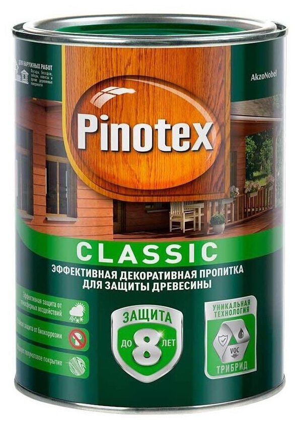 Антисептик Pinotex Classic - инновационная защитно-декоративная пропитка для древесины с льняным маслом и эффективными добавками против образования плесени, водорослей и грибковых поражений. Средство для наружных работ легко наносится кистью, быстро проникает в глубокие слои древесины. Полуматовое финишное покрытие подчеркивает природную красоту древесной текстуры, на несколько лет предохраняет поверхность от пагубного воздействия атмосферных осадков, ультрафиолета и перепадов температуры.