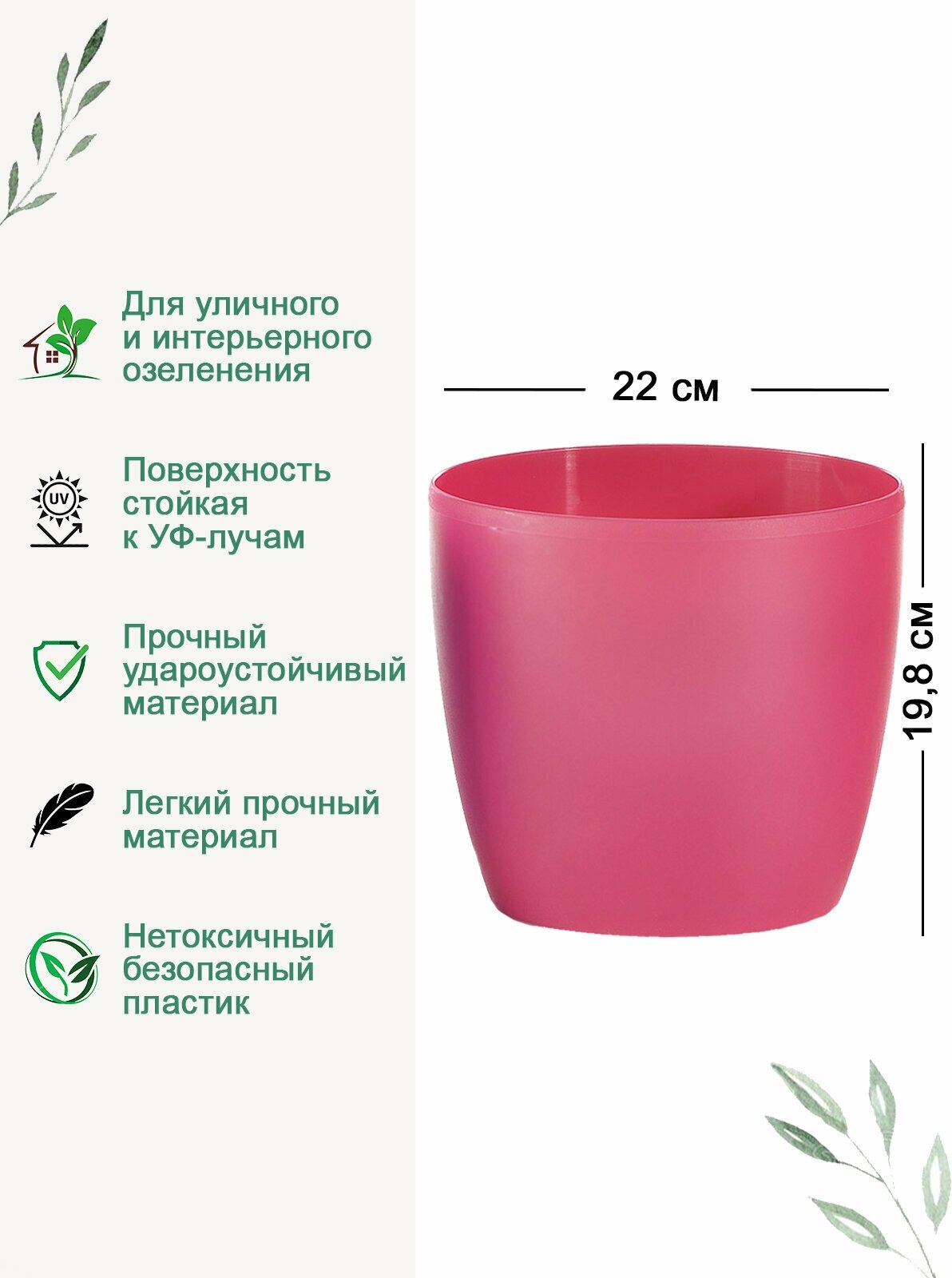 Итальянское кашпо MADEIRA — олицетворение стиля, практичности и красоты.Кашпо очень прочное и легкое, за ним легко ухаживать, поверхность устойчива к УФ-лучам и не выцветает на солнце — идеальный вариант как для жилого помещения, так и для общественных мест с большой проходимостью!Стильный и лаконичный дизайн модели впишется в любое пространство, а многообразие трендовых оттенков в линейке поможет вашему интерьеру заиграть новыми красками.Итальянский производитель заботится об окружающей среде, поэтому кашпо изготовлено из качественного нетоксичного пластика, который подлежит дальнейшей переработке. Универсальная модель итальянского бренда Teraplast - это идеальное решение для уличного и интерьерного озеленения. Цвет: розовый Размер: диаметр - 22 см, высота — 19,8 см Температура хранения: -30 +60 °С