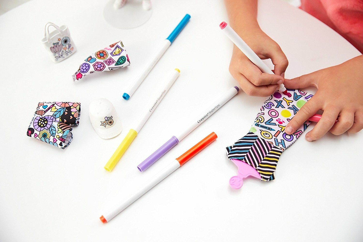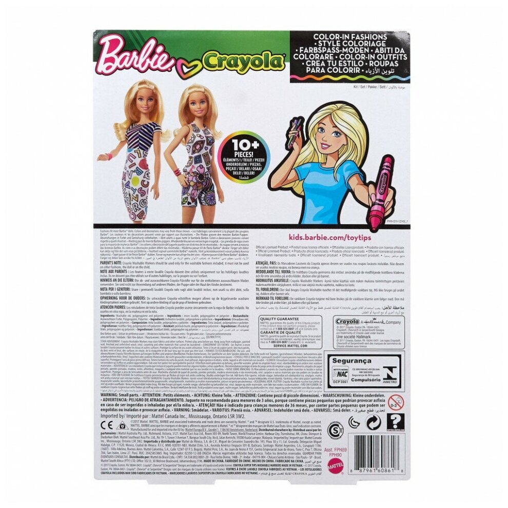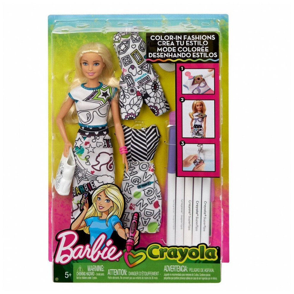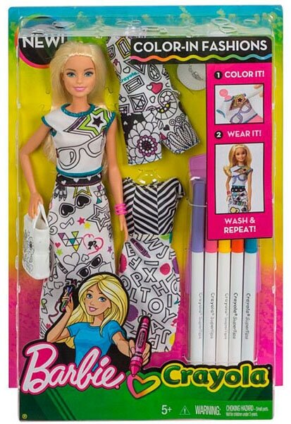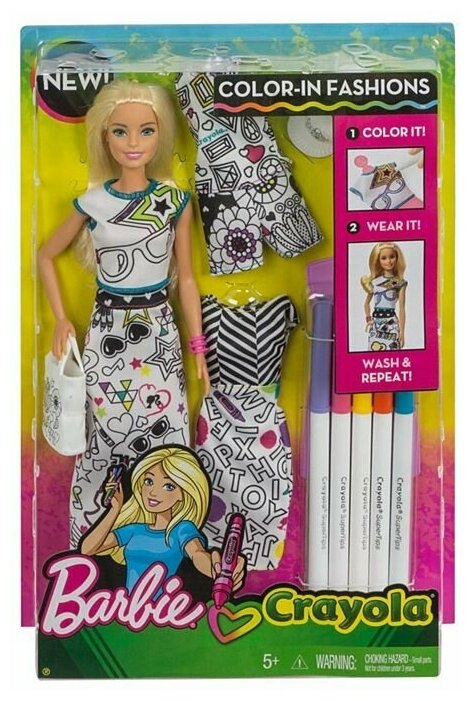 Этот игровой набор поможет маленьким поклонницам Барби создавать для любимой куклы оригинальные наряды своими руками. Пора раскрасить три разных комплекта одежды в яркие цвета с помощью 5-ти специальных фломастеров Crayola. Все наряды выполнены в белом цвете, на них нанесен принт с черным контуром. Но это еще не все! Яркие рисунки на одежде можно смывать, и раскрашивать наряды заново, создавая совершенного новые образы. Настоящий полет фантазии! Девочка придумает так много сюжетов для игры.