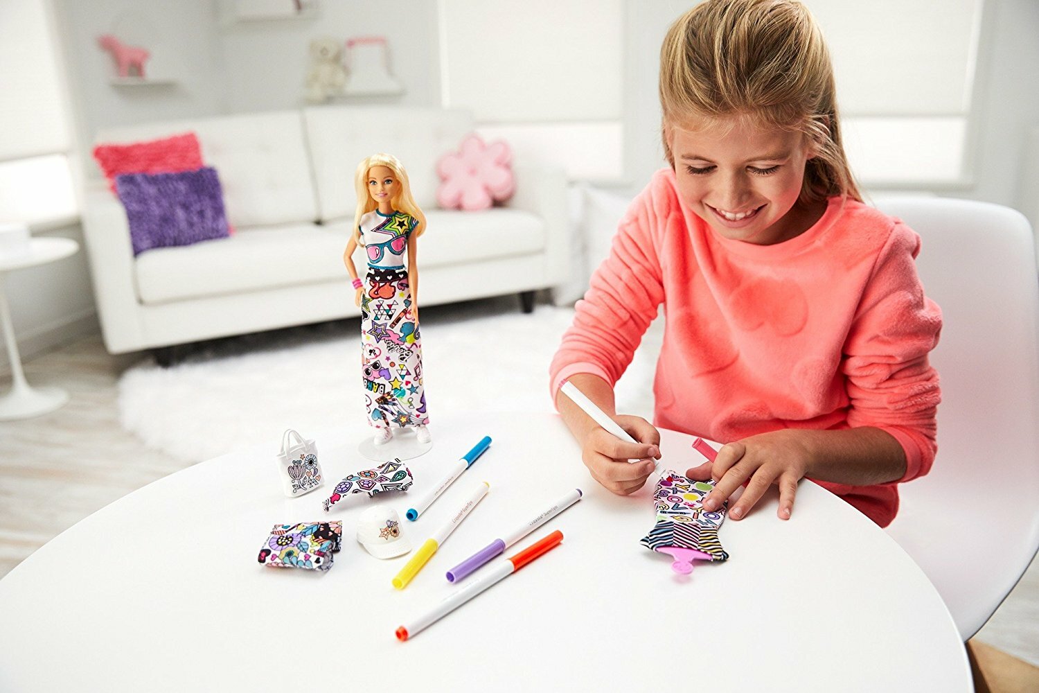 Данный набор позволит вашей дочке не только весело и интересно провести время со своей куклой Барби, но и сделать ее наряды уникальными и впечатляющими, используя свою фантазию, воображение, а также специальные фломастеры, предназначенные для рисования по ткани.