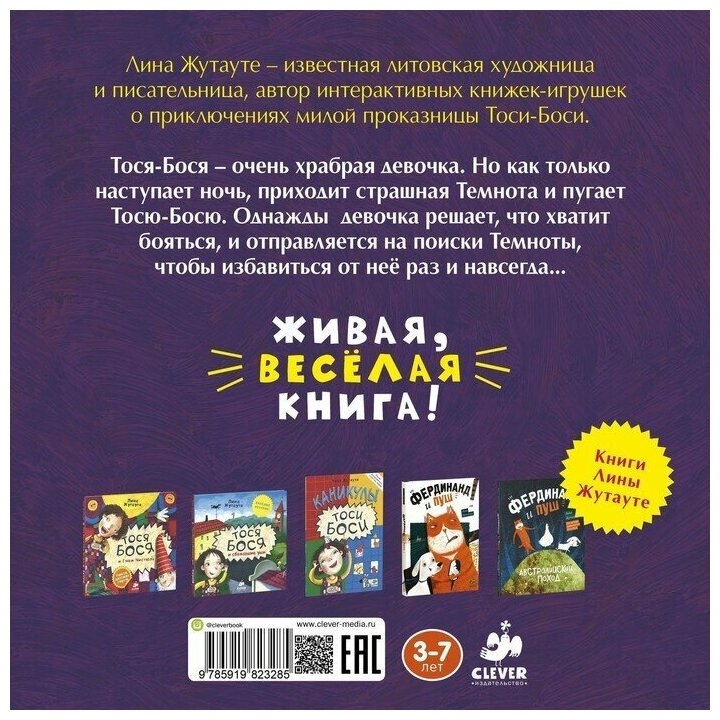 Лина Жутауте – известная литовская художница и писательница, автор интерактивных книжек-игрушек о приключениях милой проказницы Тоси-Боси. Тося-Бося – очень храбрая девочка. Но как только наступает ночь, приходит страшная Темнота и пугает Тосю Босю. Однажды девочка решает, что хватит бояться, и отправляется на поиски Темноты, чтобы избавиться от нее раз и навсегда...
