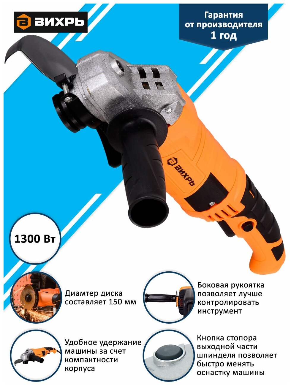 Углошлифовальная машина Вихрь - надежный прибор для разнообразных ремонтных работ, воплотивший в себе долговечность, последние технологии и востребованные функции.